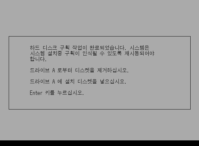 하드 디스크 준비가 완료되었습니다. 드라이브에서 디스켓을 제거한 후 엔터를 눌러 시스템을 재시작합니다.