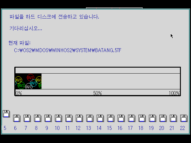 파일 복사 중입니다. OS/2 H2.1 베타는 22번 디스크까지 있습니다.