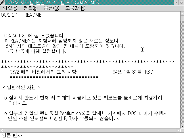Readme 파일을 열어보았습니다. 이 파일을 통해 이것이 OS/2 2.1 베타 한글판임을 알 수 있습니다.