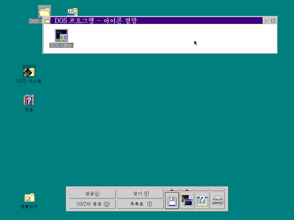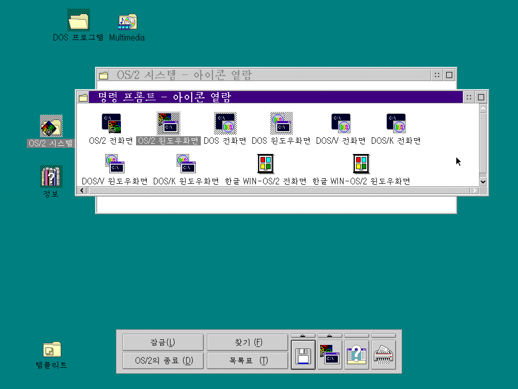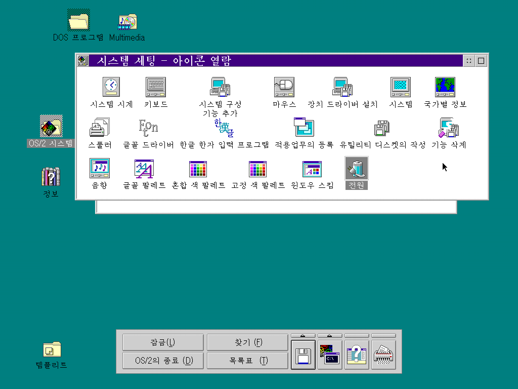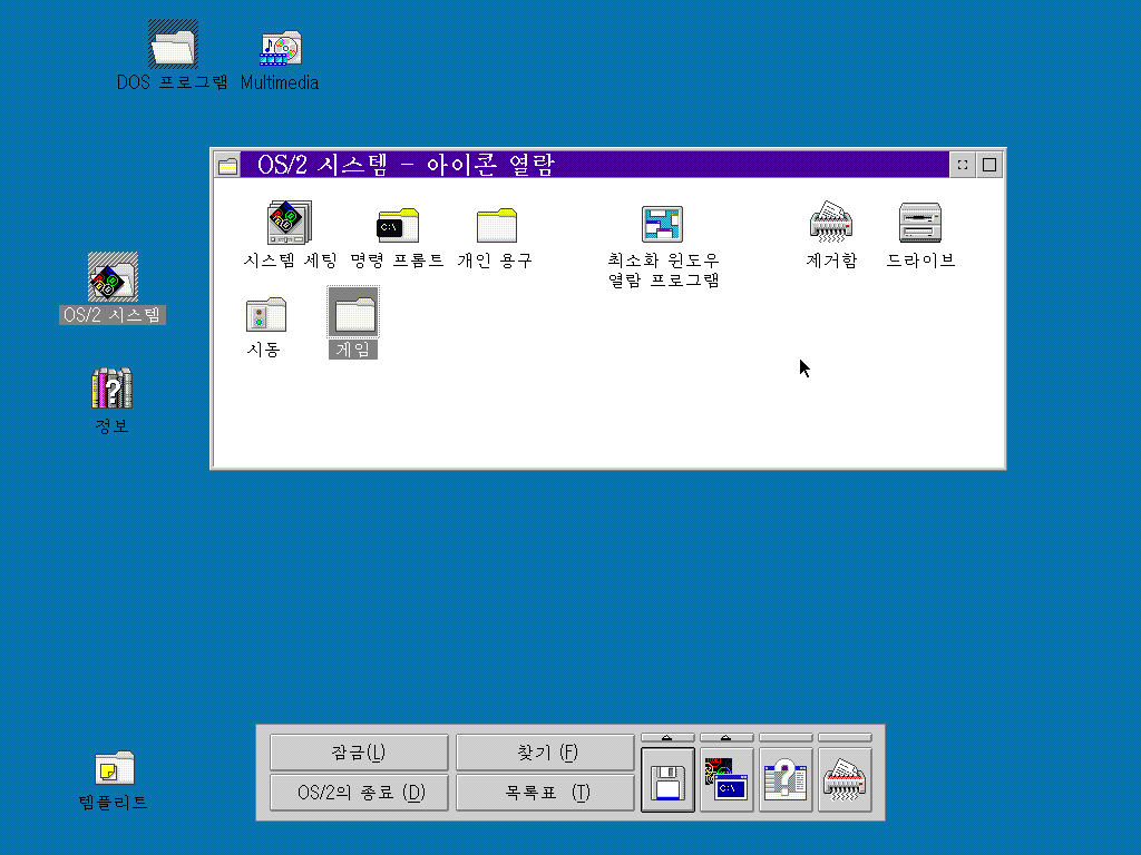OS/2 시스템 항목을 열어보았습니다. 시스템 세팅, 명령 프롬트, 개인 용구, 제거함, 드라이브, 시동, 게임 항목이 있습니다. 창을 최소화한 프로그램을 볼 수도 있습니다.