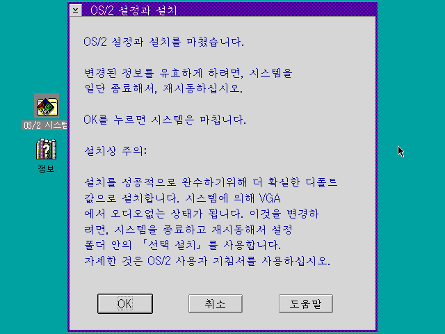 OS/2 설정 및 설치치를 마쳤습니다. OK를 누릅니다.