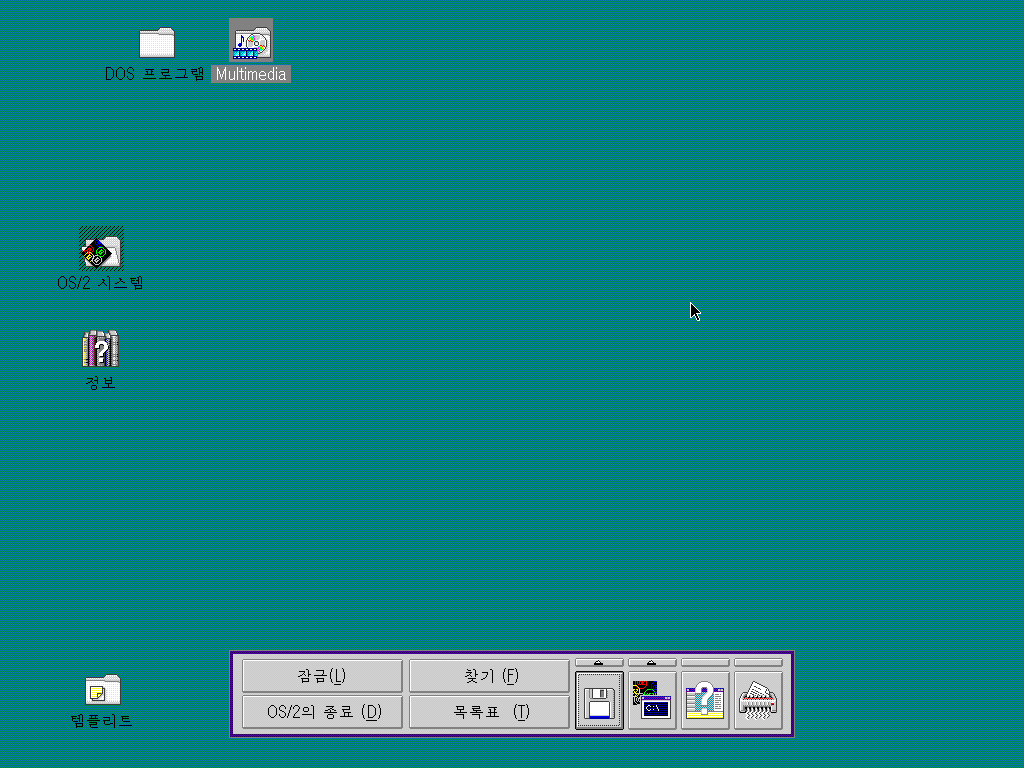 바탕화면의 모습입니다. 기본 배경색이 윈도우 95의 기본 배경색과 같은 색이 되었습니다. 여전히 작업표시줄은 없지만, 화면 하단에 여러가지 기능을 실행할 수 있는 비슷한 바가 생겼습니다.