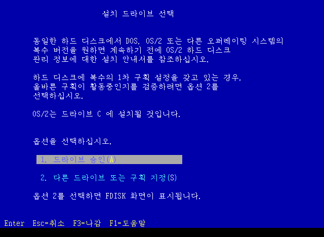 OS/2를 설치할 드라이브를 선택합니다. C드라이브에 설치하려면 1번 드라이브 승인을 선택합니다.