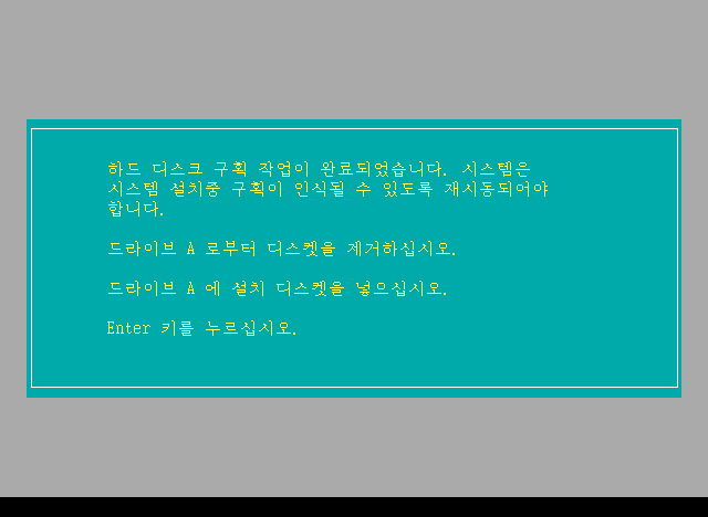 하드 디스크 구획 작업이 완료되었습니다. 1번 디스켓을 빼고 다시 설치 디스켓을 넣고 엔터를 누릅니다.