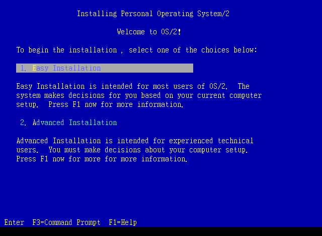 OS/2 설치를 환영하는 창이 나옵니다. 베타 버전이라서 그런지 영어로 나옵니다. 1번 쉬운 설치를 선택합니다.