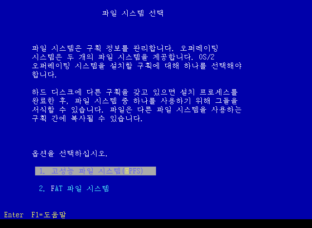드라이브의 파일 시스템을 선택합니다. 고성능 파일 시스템 HPFS를 선택합니다.