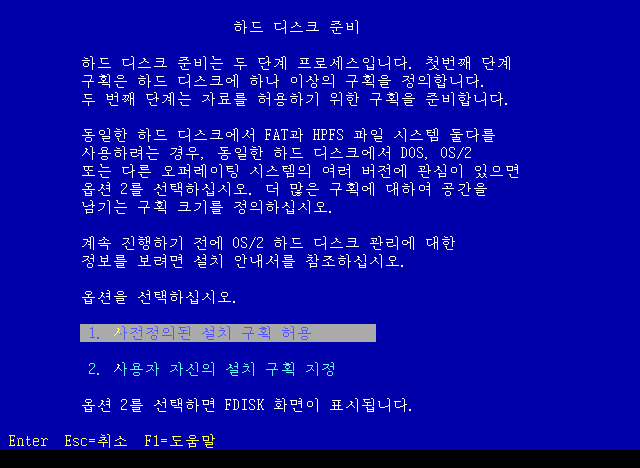 하드 디스크를 준비합니다. 1번 사전정의된 설치 구획 허용을 선택합니다.
