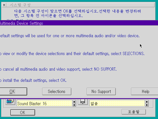 멀티미디어 장치 설정을 합니다. 영문으로 나오는데, 한가지 이상의 멀티미디어 오디오/비디오 장치의 기본 설정이 사용될 것이라고 합니다. 장치 선택과 기본 설정을 보거나 수정하기 위해서는 선택을 누르고, 모든 오디오/비디오 지원을 취소하려면 지원 없음을 선택하라네요. 기본값 설치를 위해 OK를 누릅니다.