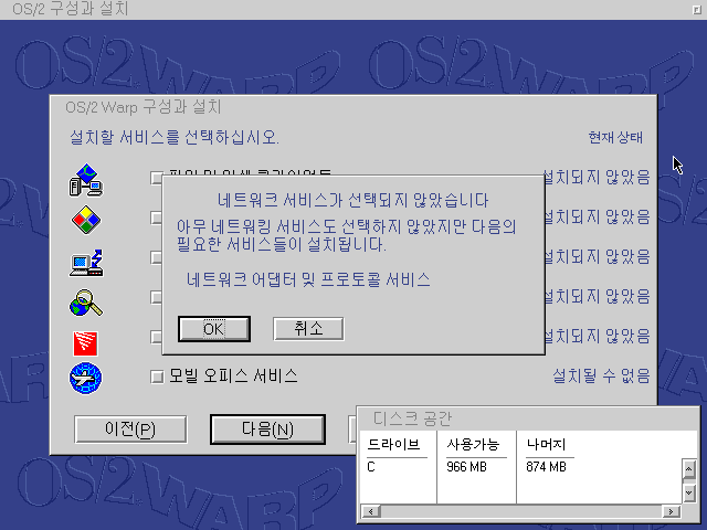 네트워크 어댑터 및 프로토콜 서비스 설치 중입니다. OS/2 Warp를 선택해줘서 감사하다는 IBM의 인사 문구가 왜 안쓰럽게 느껴질까요...