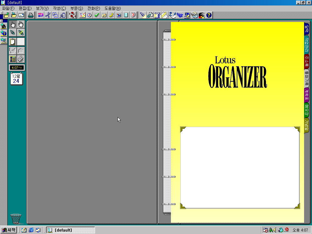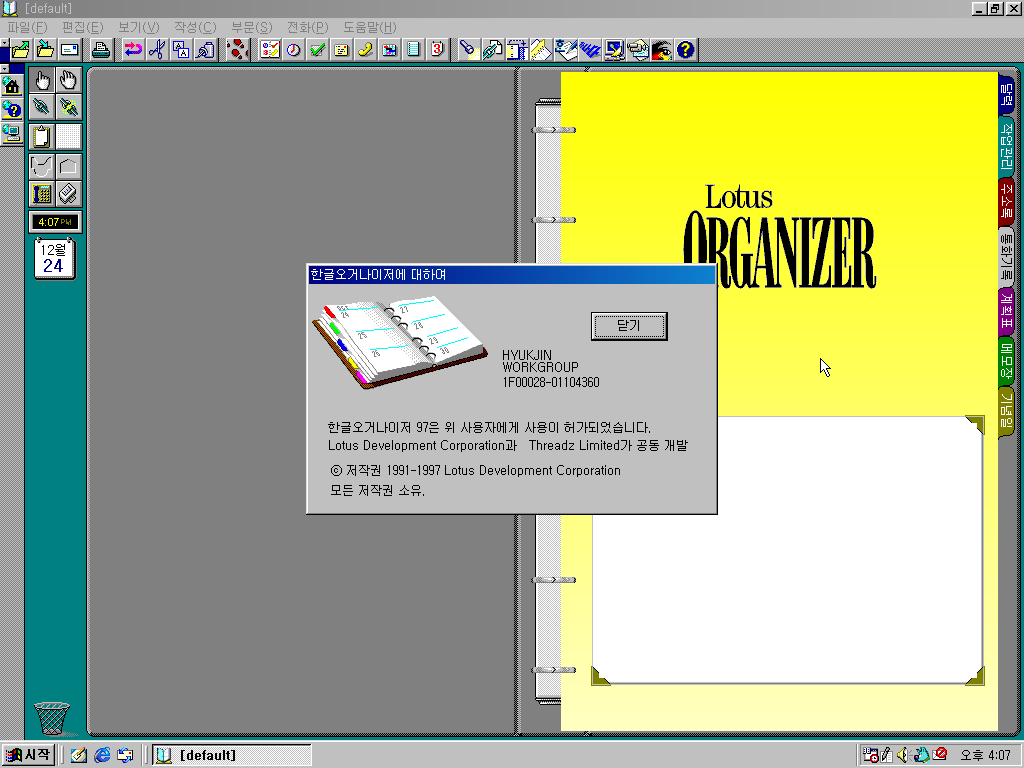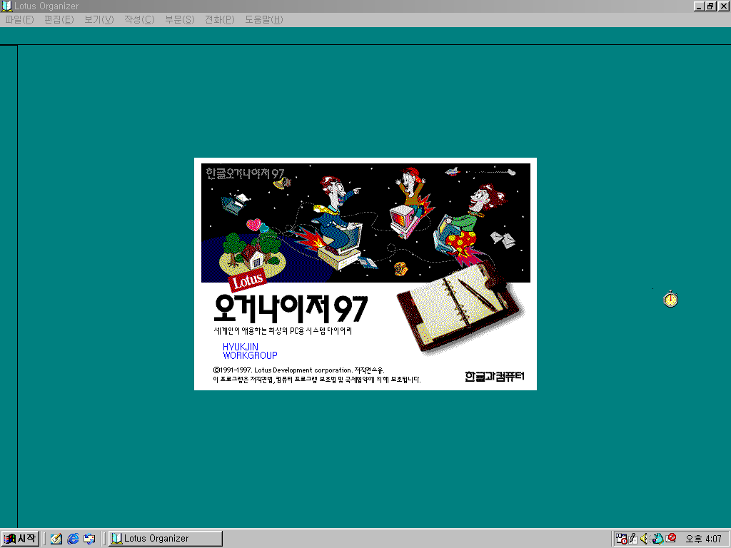 다음은 오거나이저 97입니다. 역시 한컴홈 로고 그림이 적용되었습니다.