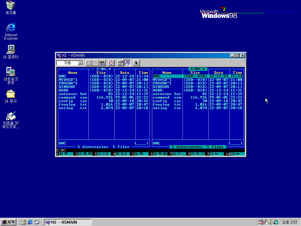 한컴홈 97 유틸리티로 이름을 바꾼 한컴쉘입니다. 도스 쉘과 같이 파일 관리하는 기능이 있습니다.