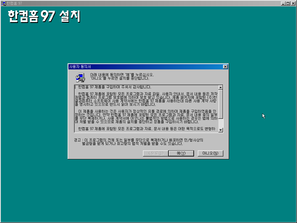 한컴홈 97 설치를 시작합니다. 사용자 동의서에 예를 누릅니다.