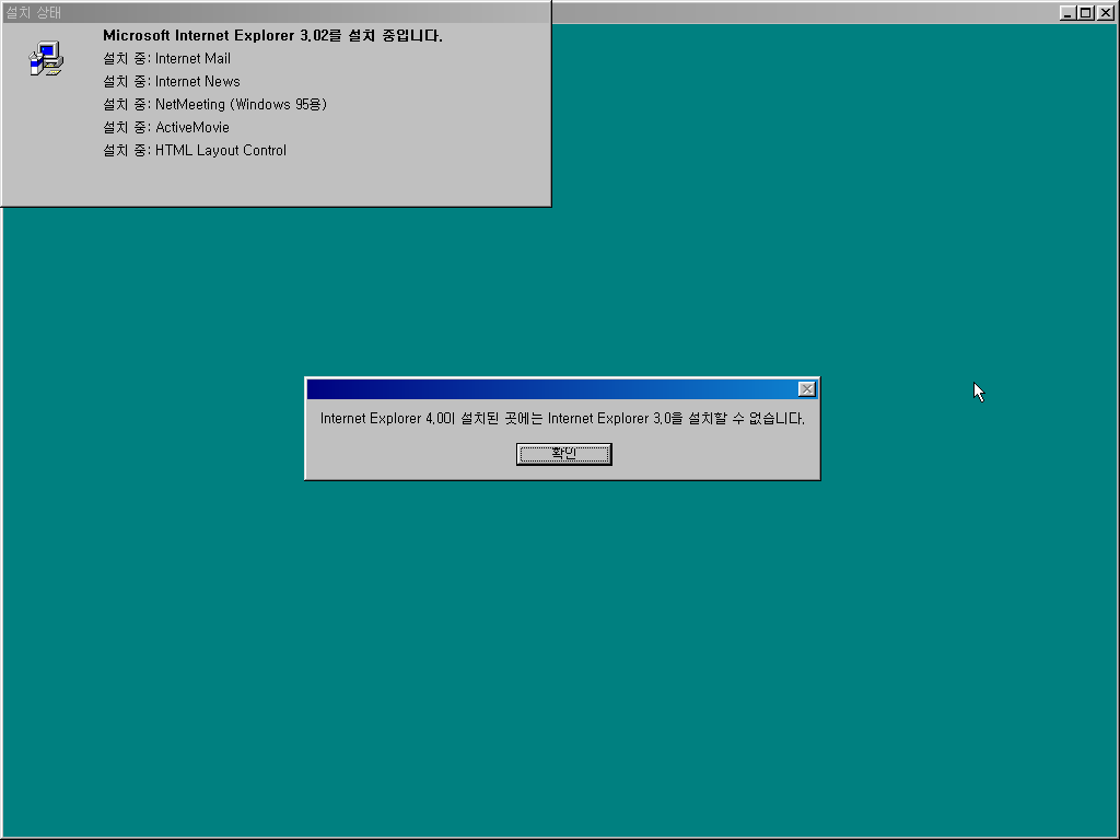 하지만 제가 실행한 윈도우 98 SE에는 이미 IE 5.0이 깔려있기 때문에, IE 3.02가 깔리지는 않습니다.