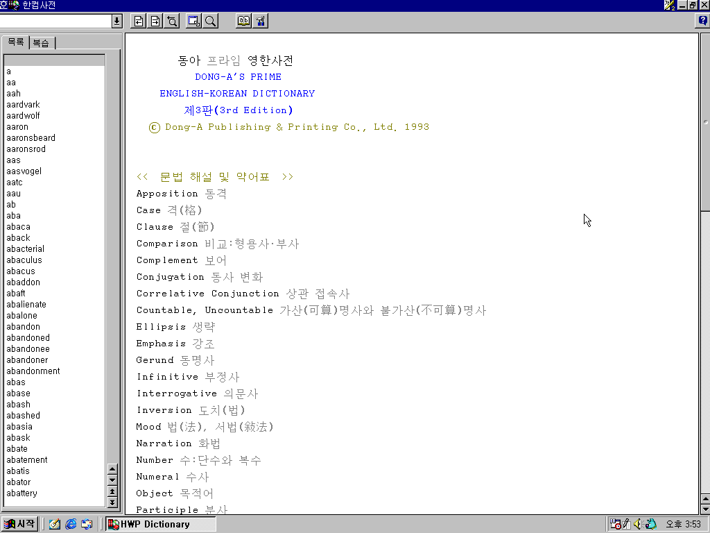 다음은 한컴사전의 모습입니다. 동아 프라임 영한사전을 비롯한 여러 사전이 수록되어 있습니다.