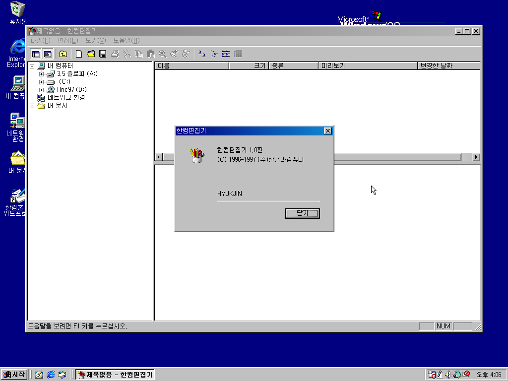 우선 한글 97부터 실행해보겠습니다.