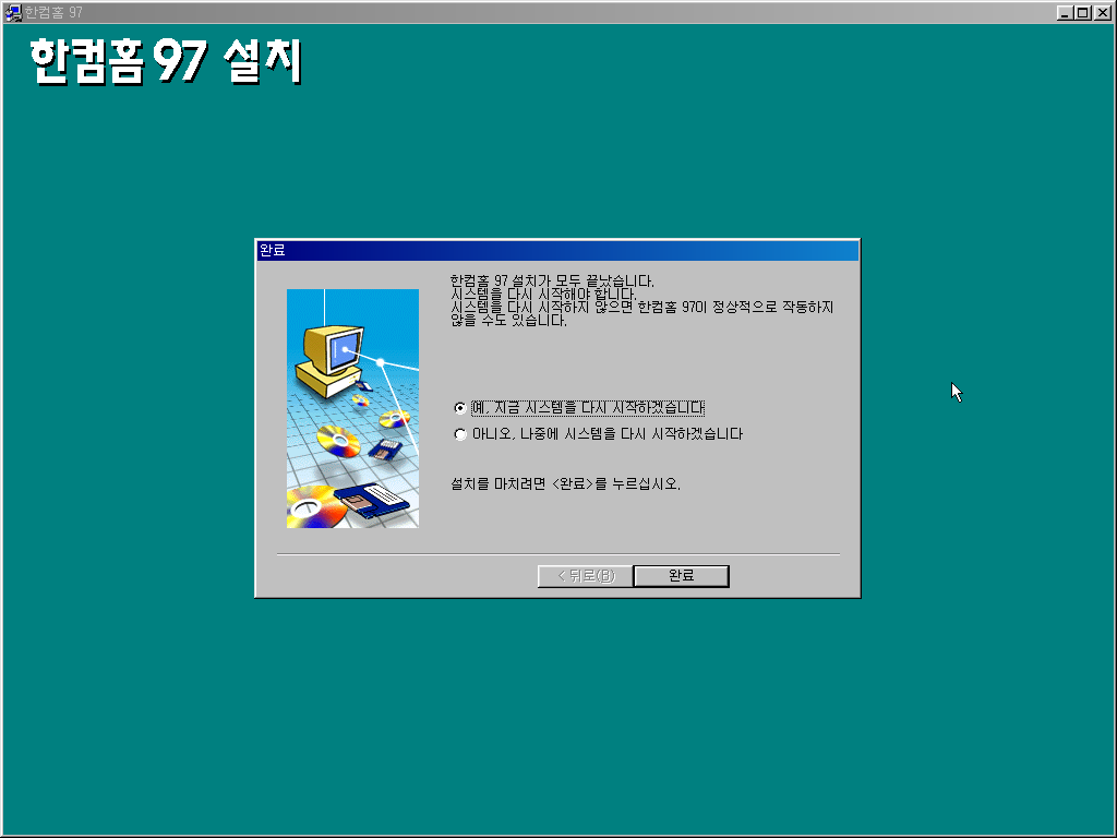 한컴홈 97 설치가 끝났습니다. 시스템을 다시 시작합니다.
