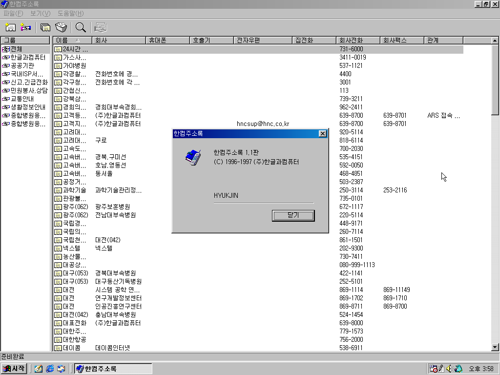한컴주소록입니다. 옛날 전화번호가 많이 있네요. 일반판에 있는 것은 1.0판이고, 한컴홈에는 1.1판이 있습니다.