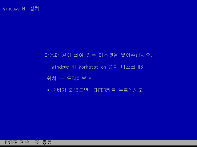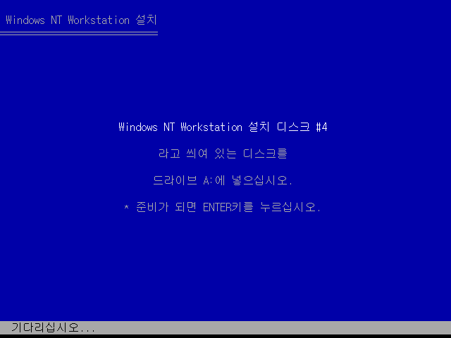 마지막으로 4번 부팅디스크를 넣고 엔터를 누릅니다. 위에서 언급했다시피 3.51의 경우는 4장이고, 3.5의 경우는 3장입니다.