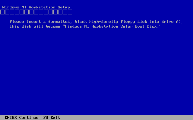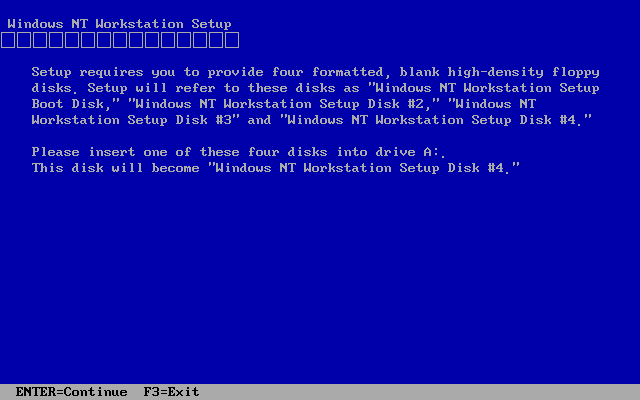 윈도우 NT 3.5 및 3.51의 원래 정석적인 설치 방법은 CD와 함께 3.5의 경우 부팅디스크 3장, 3.51의 경우 4장으로 설치하는 것입니다. 다만 실제 컴퓨터가 아닌 가상머신에서 설치할 경우 이 정석적인 방법으로 설치하려고 하면 하드 디스크를 인식하지 못하는 오류가 발생해 설치가 진행되지 않습니다. 그래서 어쩔 수 없이 하드에 먼저 도스를 설치한 후 도스에서 업그레이드 설치를 진행하는 방법밖에 없습니다. 하지만 혹시 일반적인 설치 방법으로 오류 없이 하드 디스크 인식에 성공하신 분들을 위해 이 글을 씁니다. 보통 인터넷에서 설치 파일을 구한 경우 부팅디스크는 없고 iso 파일만 있기 때문에, 부팅디스크를 제작하는 법을 알려드리겠습니다.