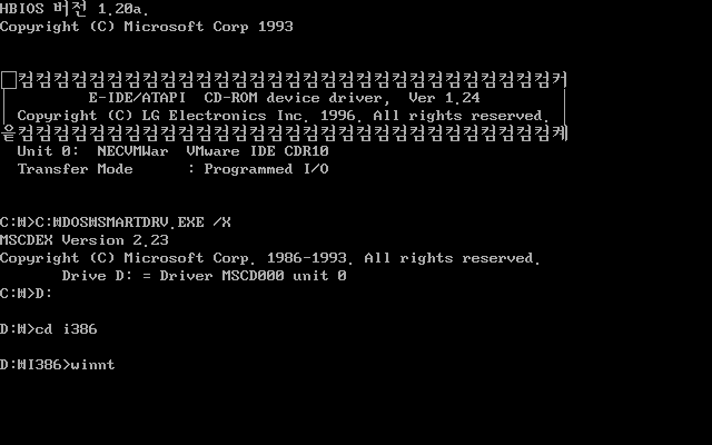 먼저 하드에 도스를 설치한 후 D드라이브에 윈도우 NT 설치 CD를 집어넣고 D드라이브의 i386 디렉토리에서 winnt 명령어를 입력합니다.