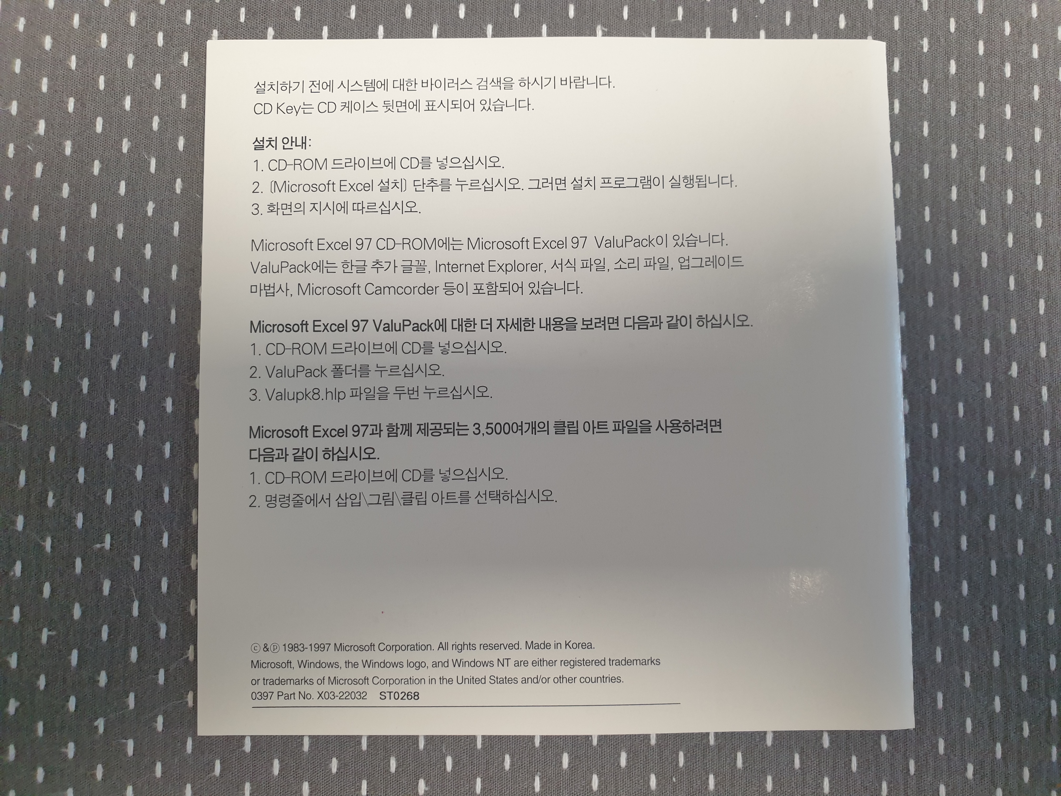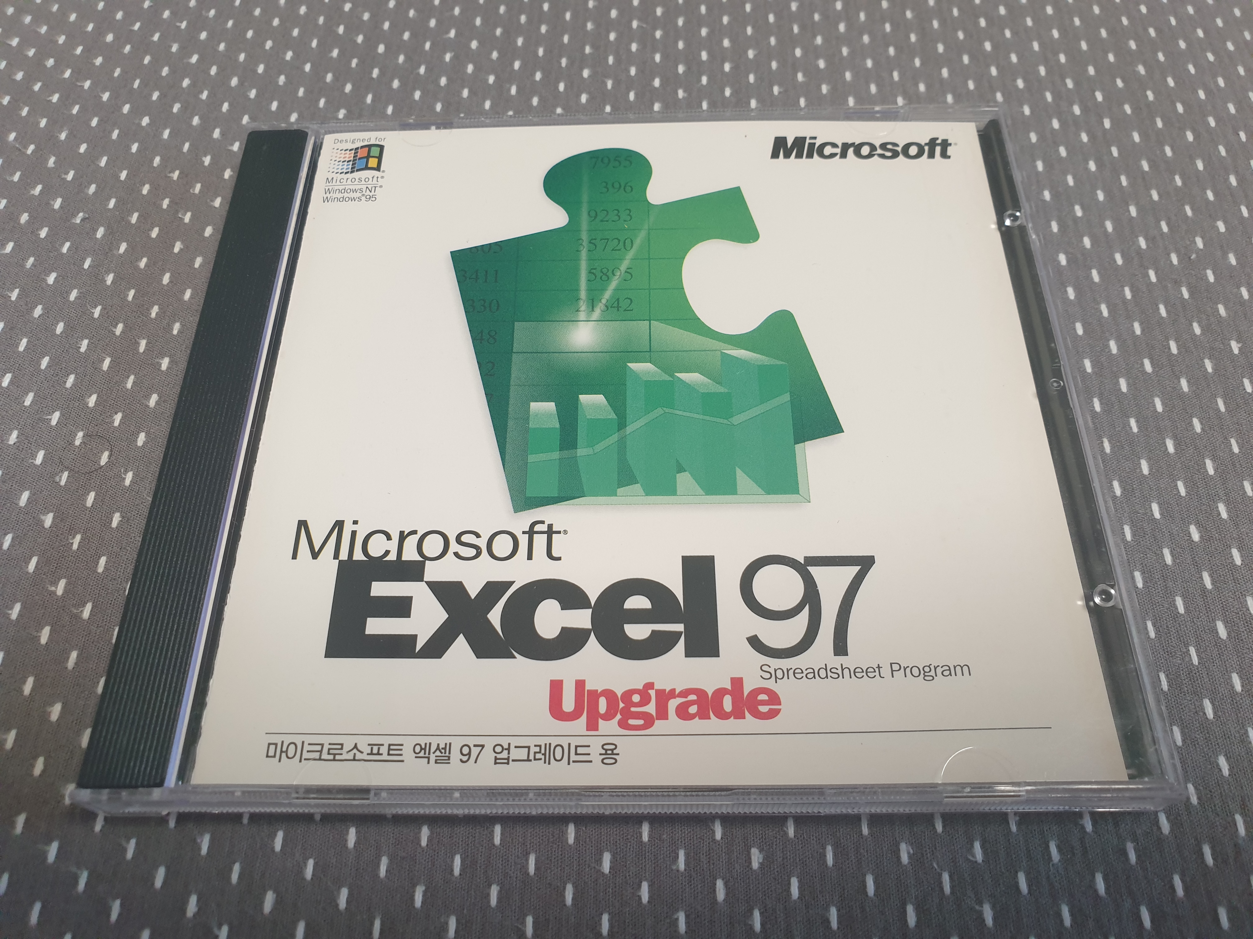 오늘 소개해드릴 소장품은 마이크로소프트 엑셀 97 CD입니다. 엑셀 97 역시 마이크로소프트 오피스 97에 포함된 버전입니다. 워드와 마찬가지로 단품으로도 출시가 되었는데, 워드보다는 엑셀 단품이 좀 더 귀한 것 같습니다. 파워포인트 단품 버전은 아예 파일로도 실물로도 보이지도 않네요... 저는 중고장터를 통해 구입했습니다.