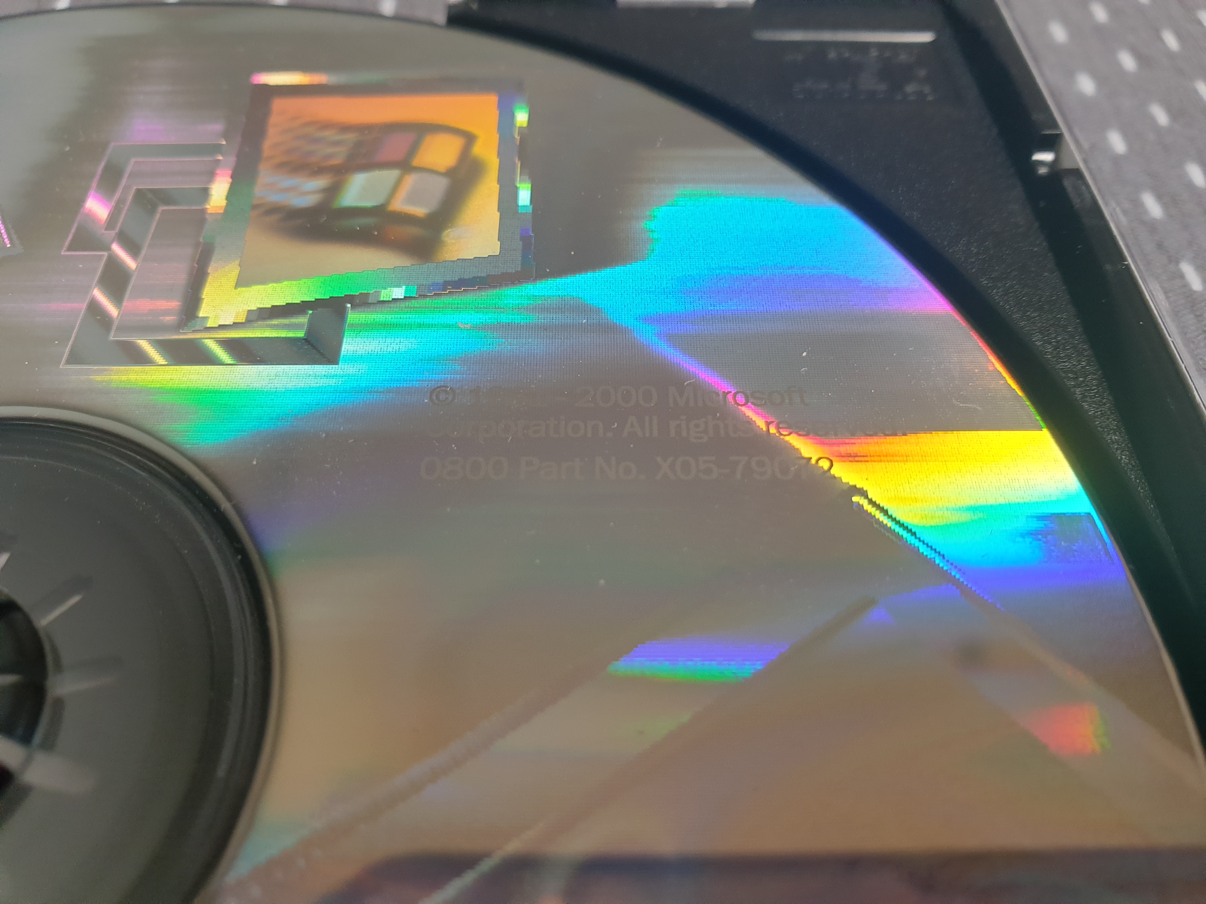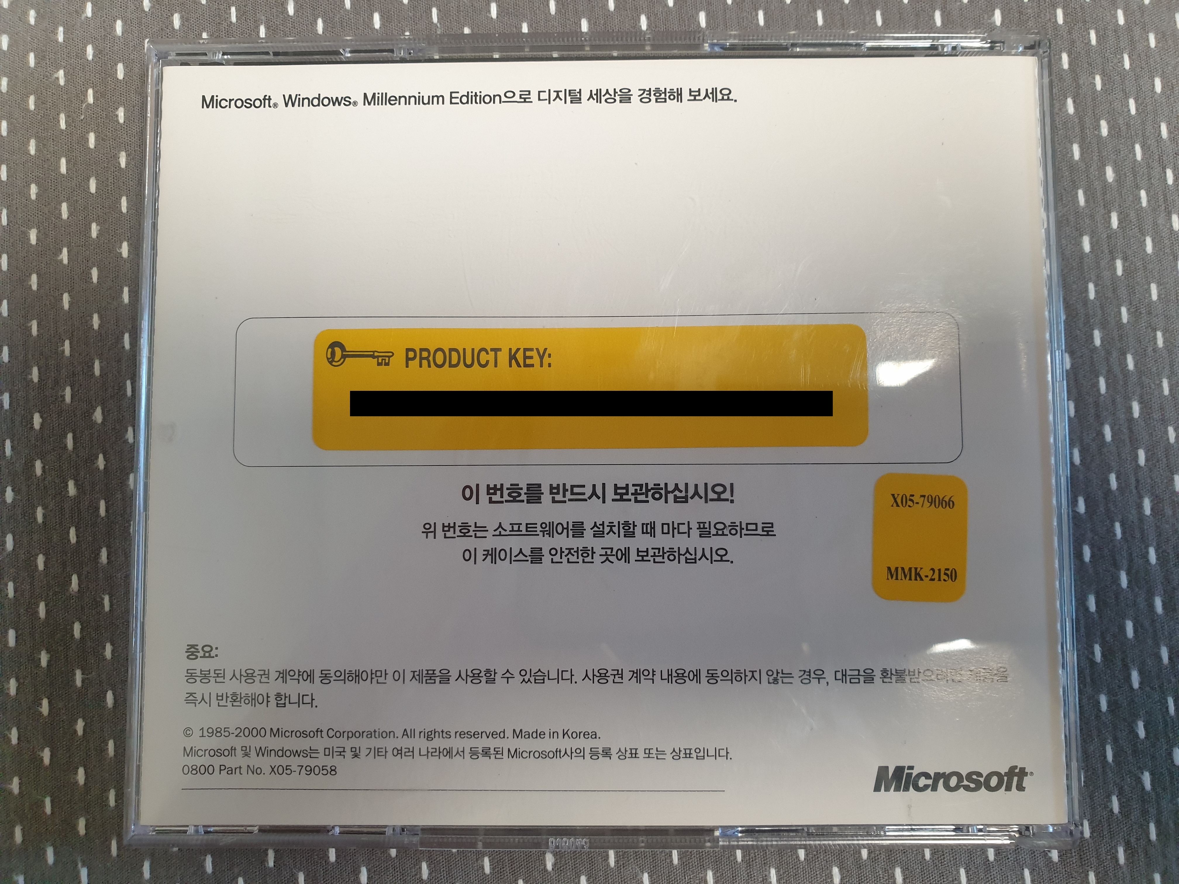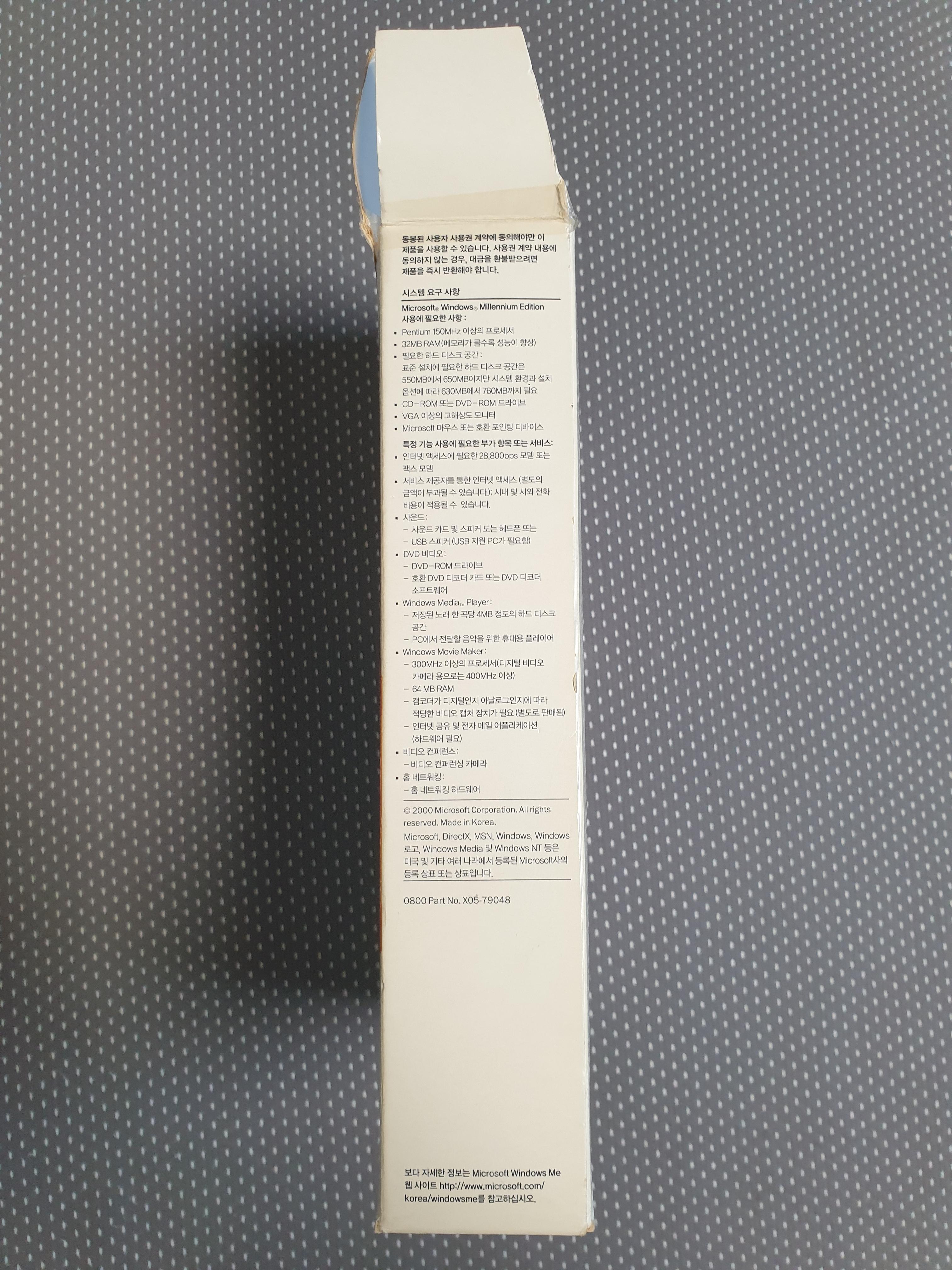 우측 상단을 확대해본 모습입니다. 카피라이트 문구가 있습니다. 파트 넘버는 X05-79072입니다. CD 라벨명은 Windows Me입니다.