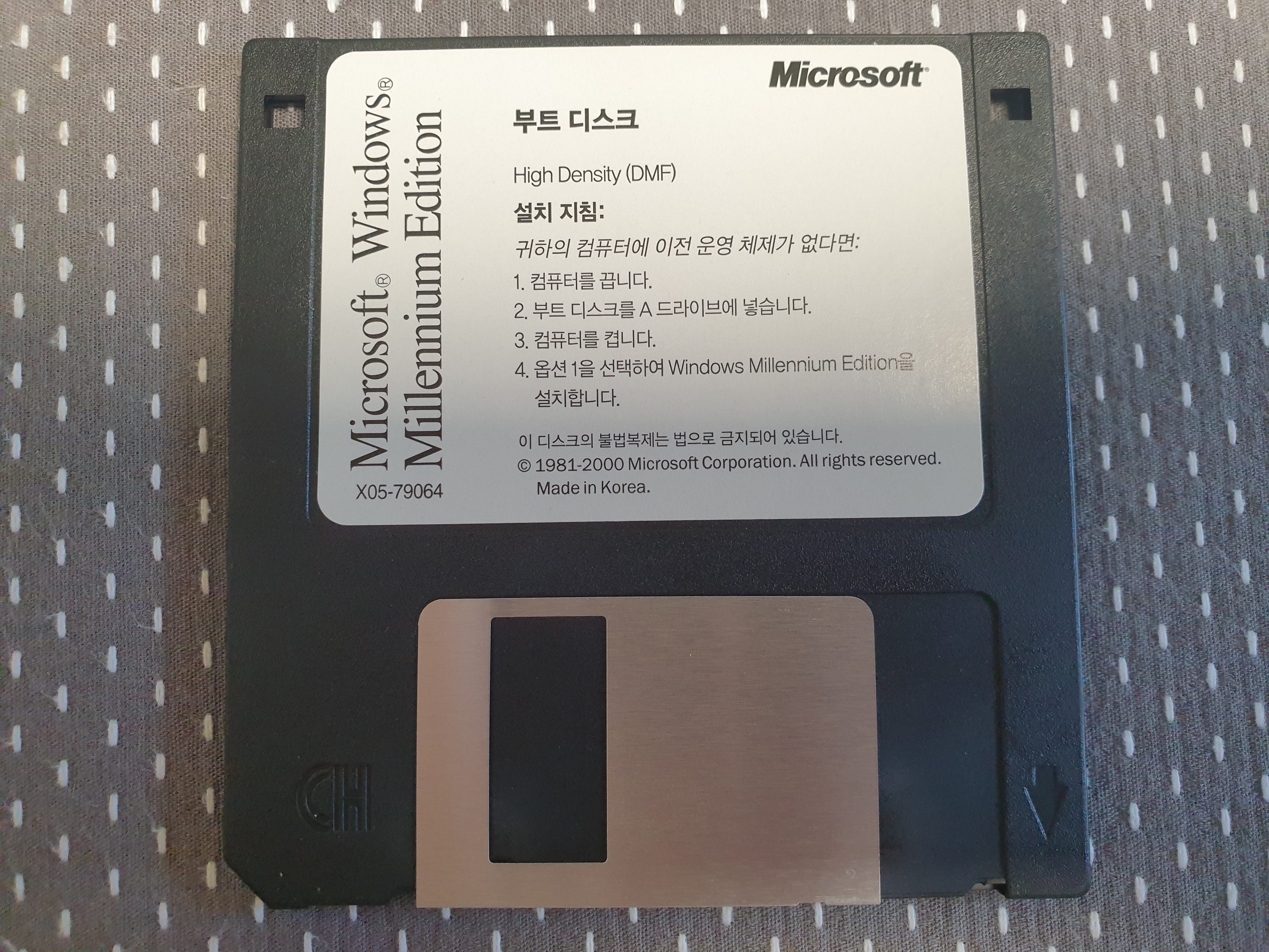부트 디스크의 모습입니다. 3.5인치 디스켓이며, 부트 디스크 사용 방법이 나와있습니다. 윈도우 95, 98, Me와 같은 9x 기반 윈도우 CD들은 혼자 부팅을 못하고 이렇게 부트 디스크를 같이 넣어야만 부팅이 되며 설치를 할 수가 있었습니다. 파트 넘버는 X05-79064입니다.