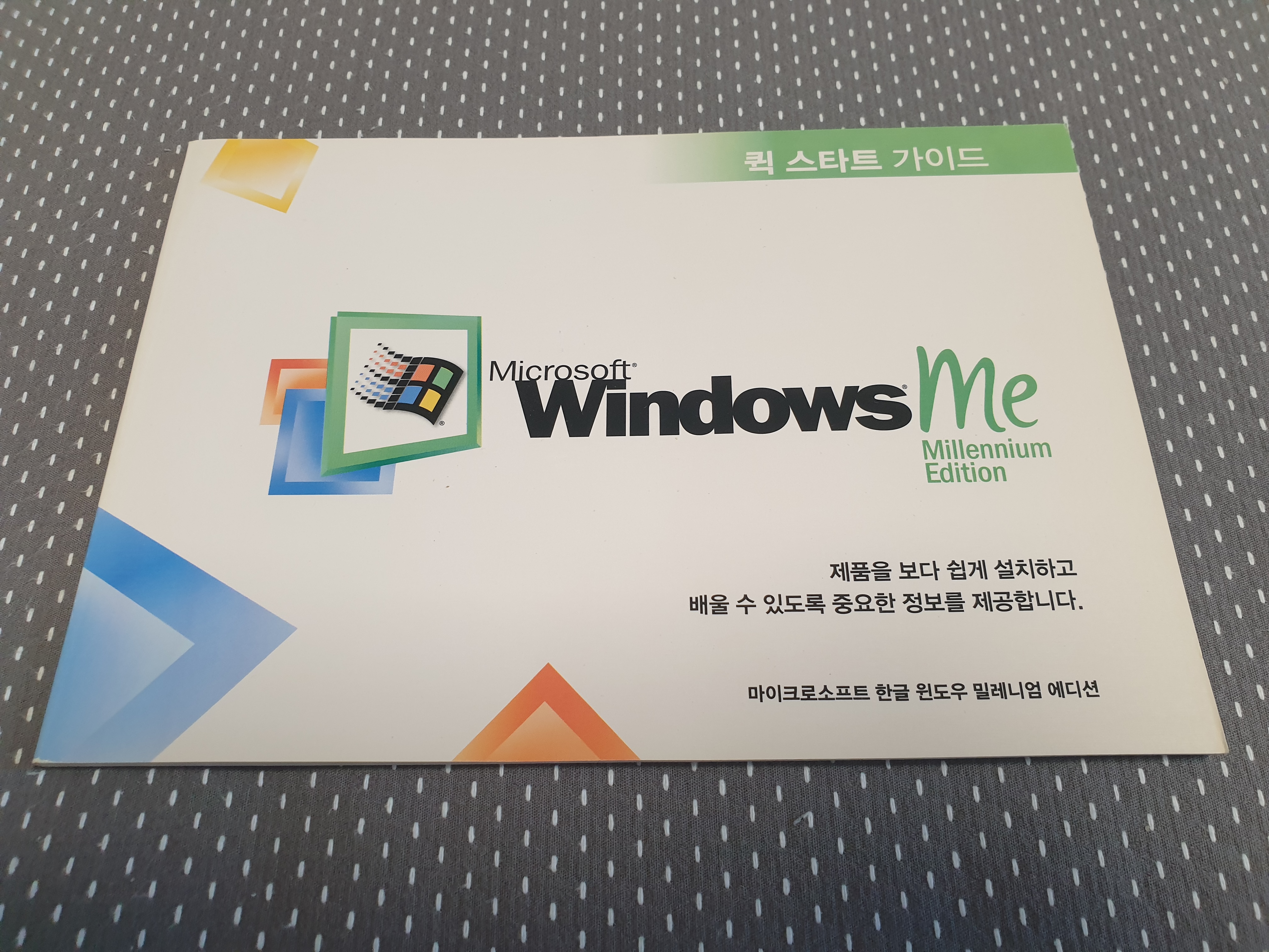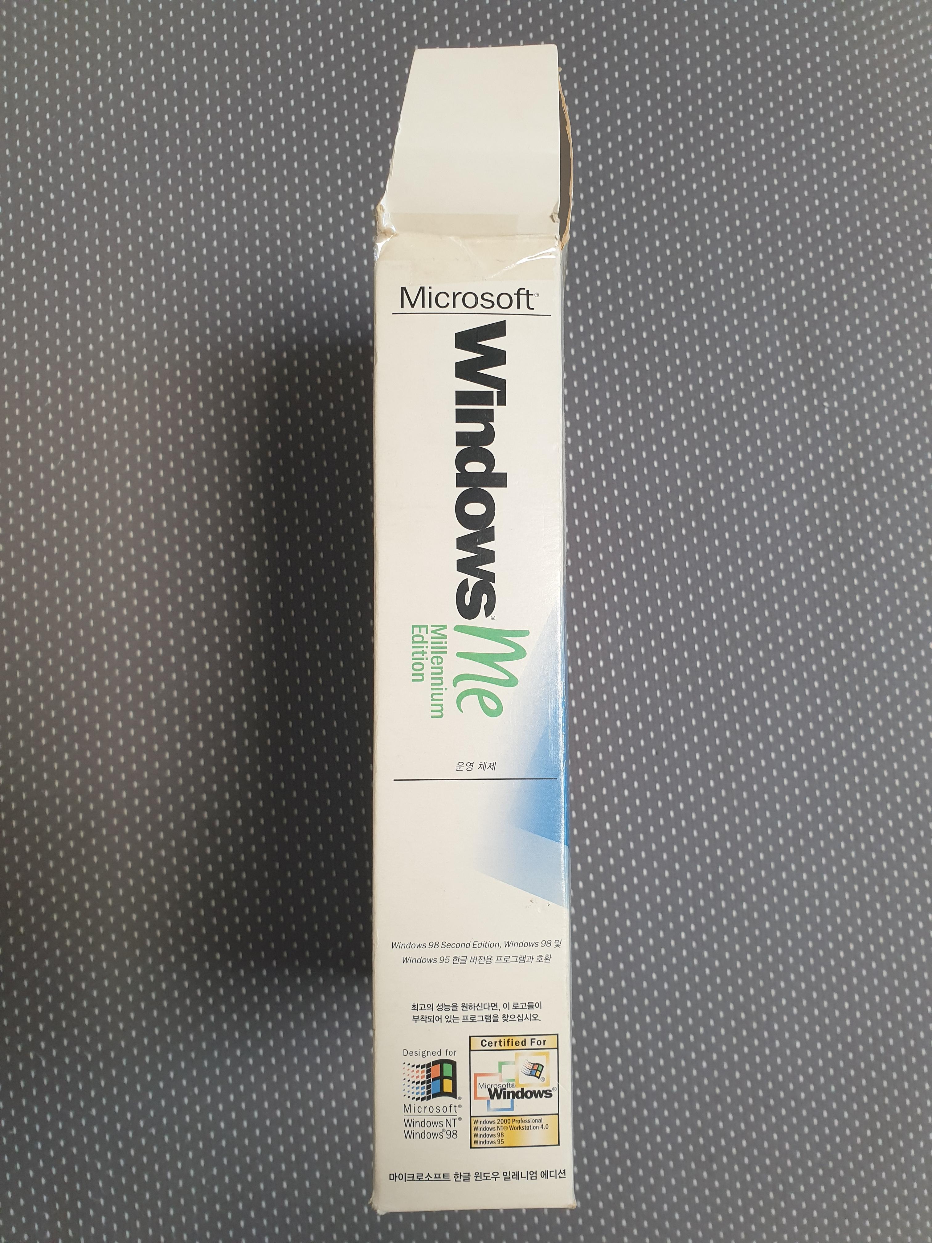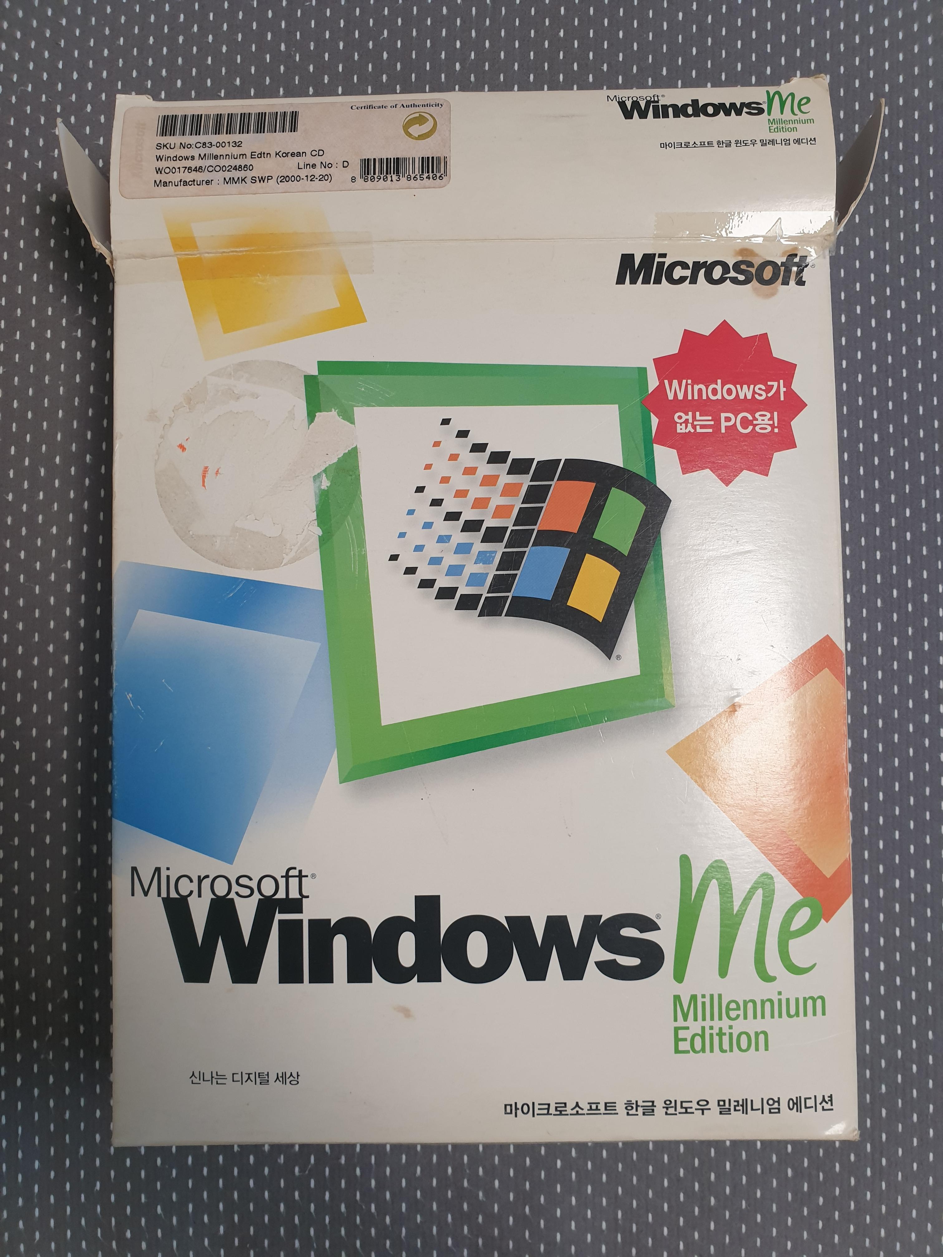 이것은 윈도우 Me 제품 박스입니다. 제가 중고장터에서 구매할 때 풀박스로 샀습니다. 윈도우가 설치되지 않은 새 PC용입니다. 알록달록한 윈도우 로고가 눈에 띕니다.