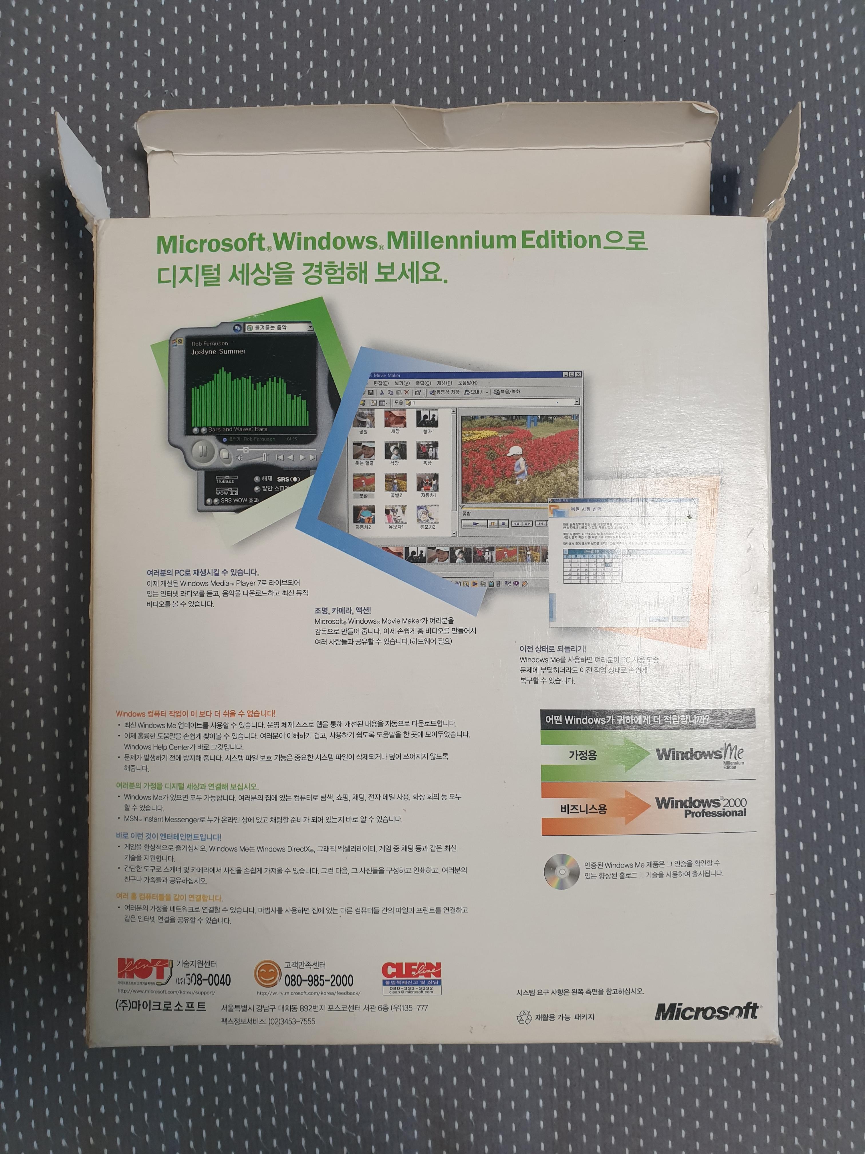 박스 뒷면에는 디지털 기능을 강조한 홍보 문구와 윈도우 Me의 여러가지 기능을 소개하고 있습니다. 이전에 올린 윈도우 2000 박스와 마찬가지로 가정용은 Me, 비즈니스용은 2000을 추천하고 있습니다.