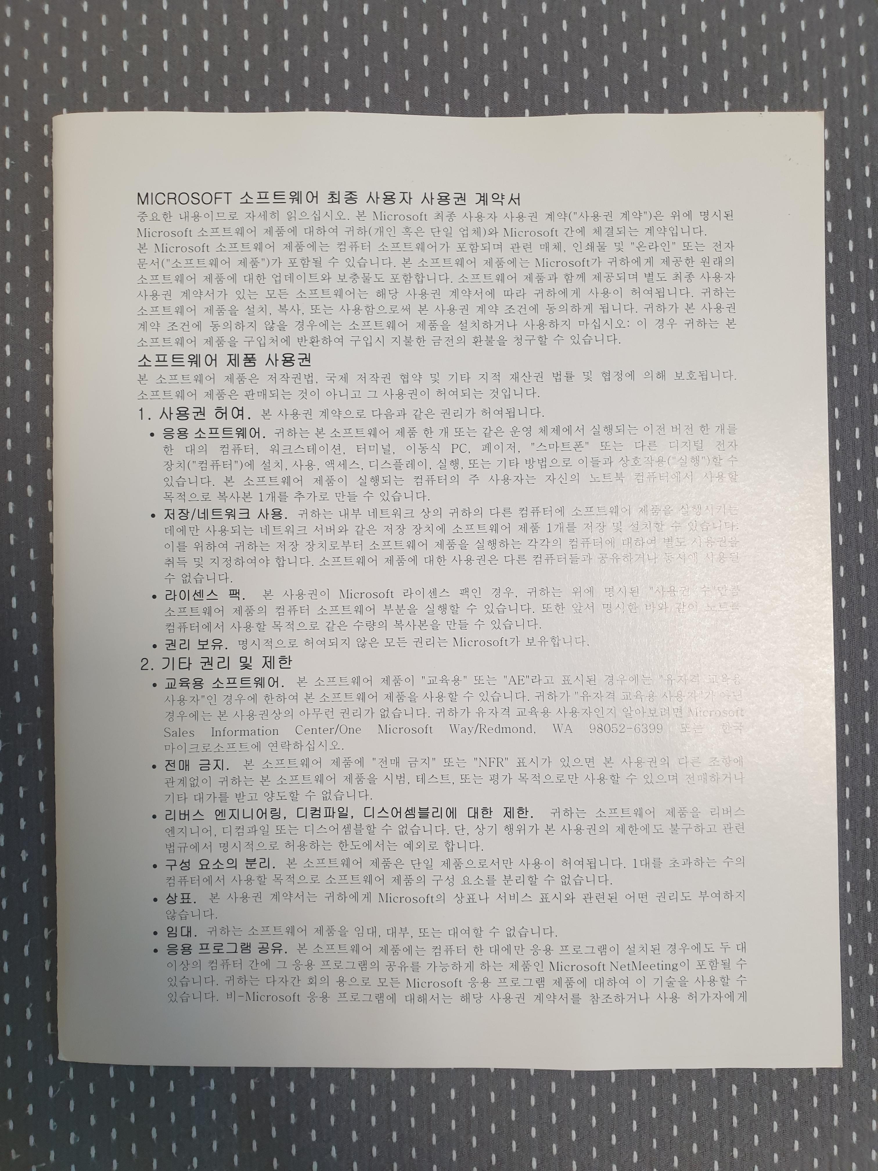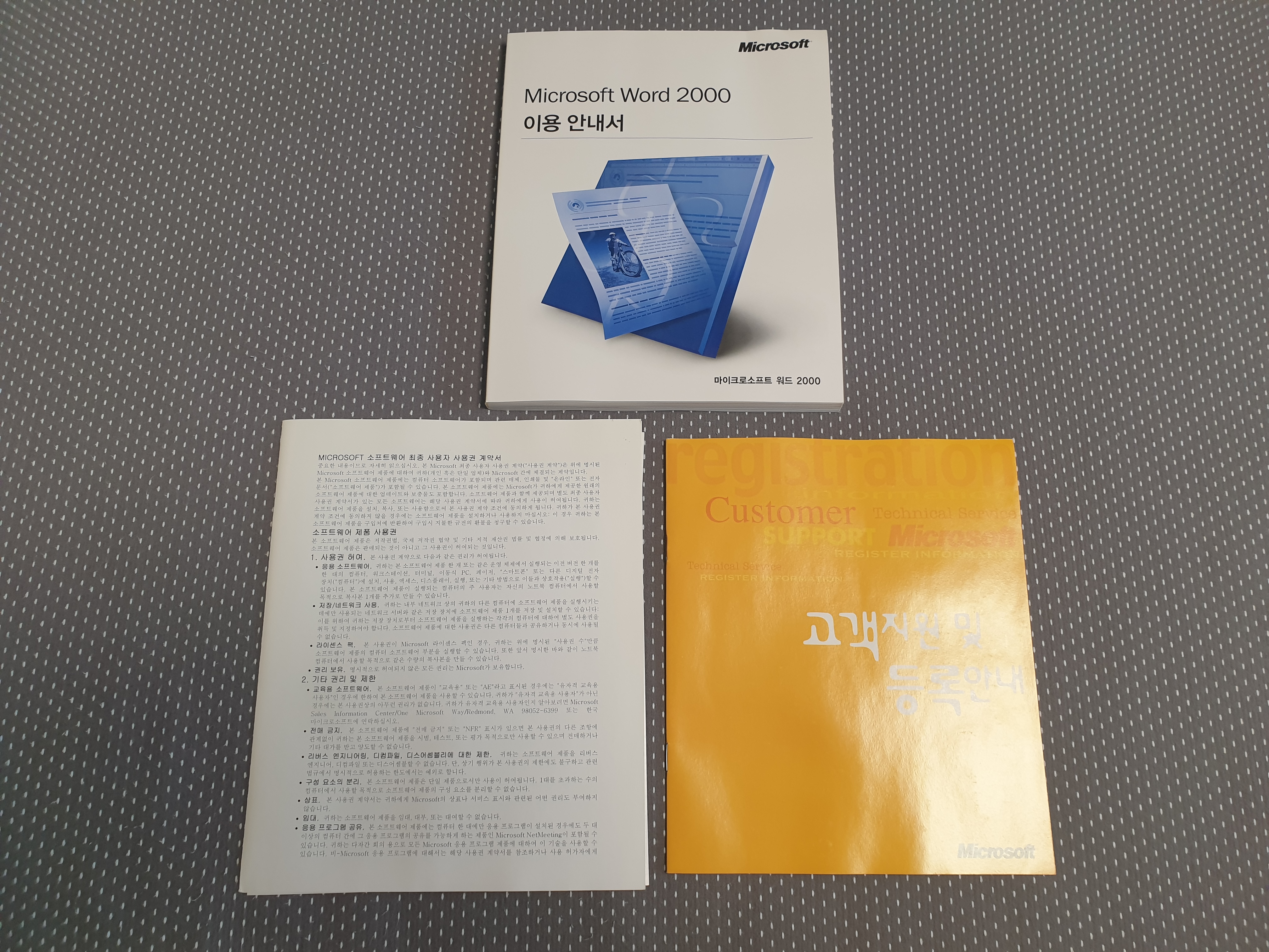 이것들은 박스 안에 들어있던 구성품입니다. 이용 안내서, 사용권 계약서, 고객지원 및 등록 안내서입니다.