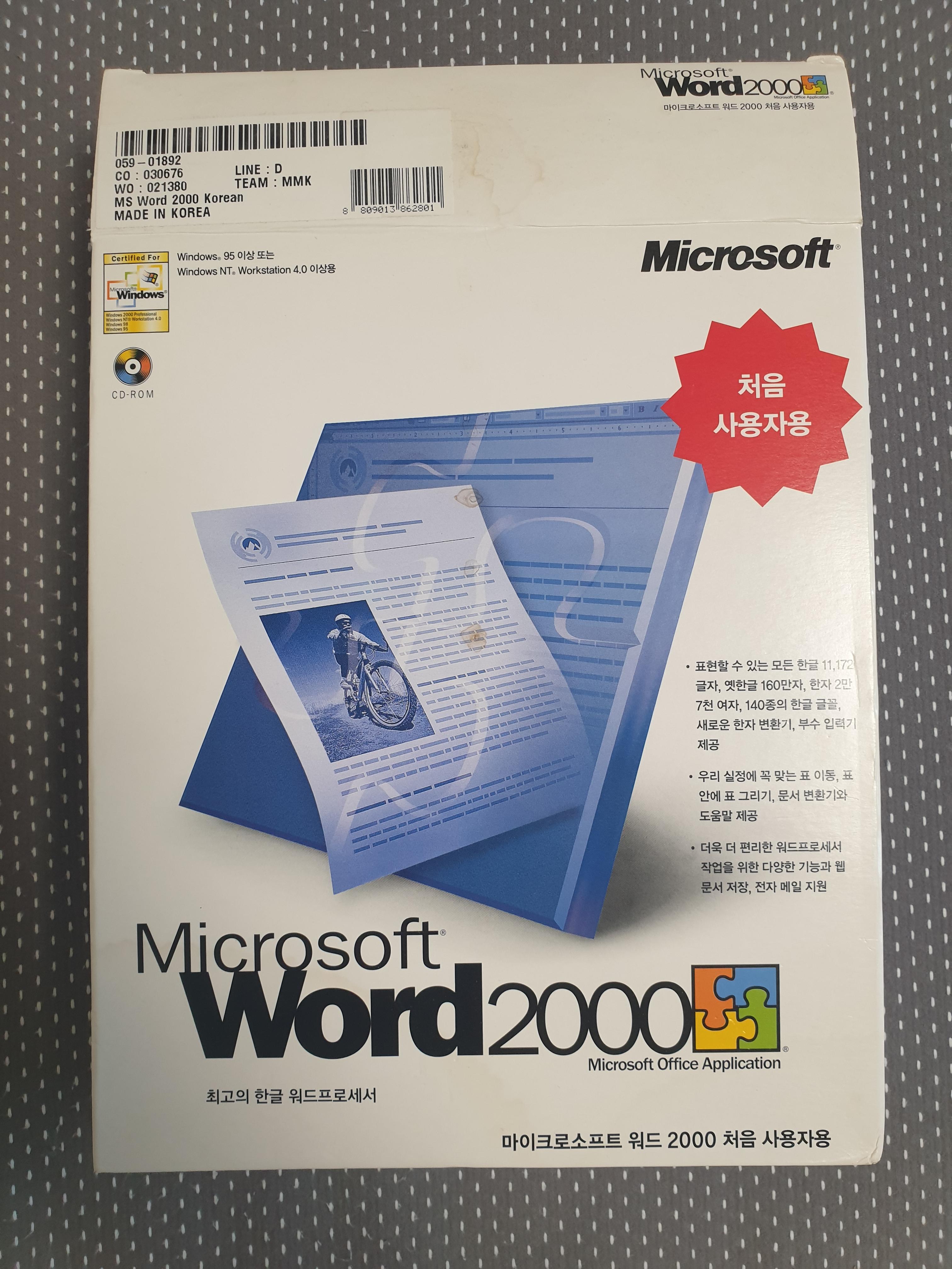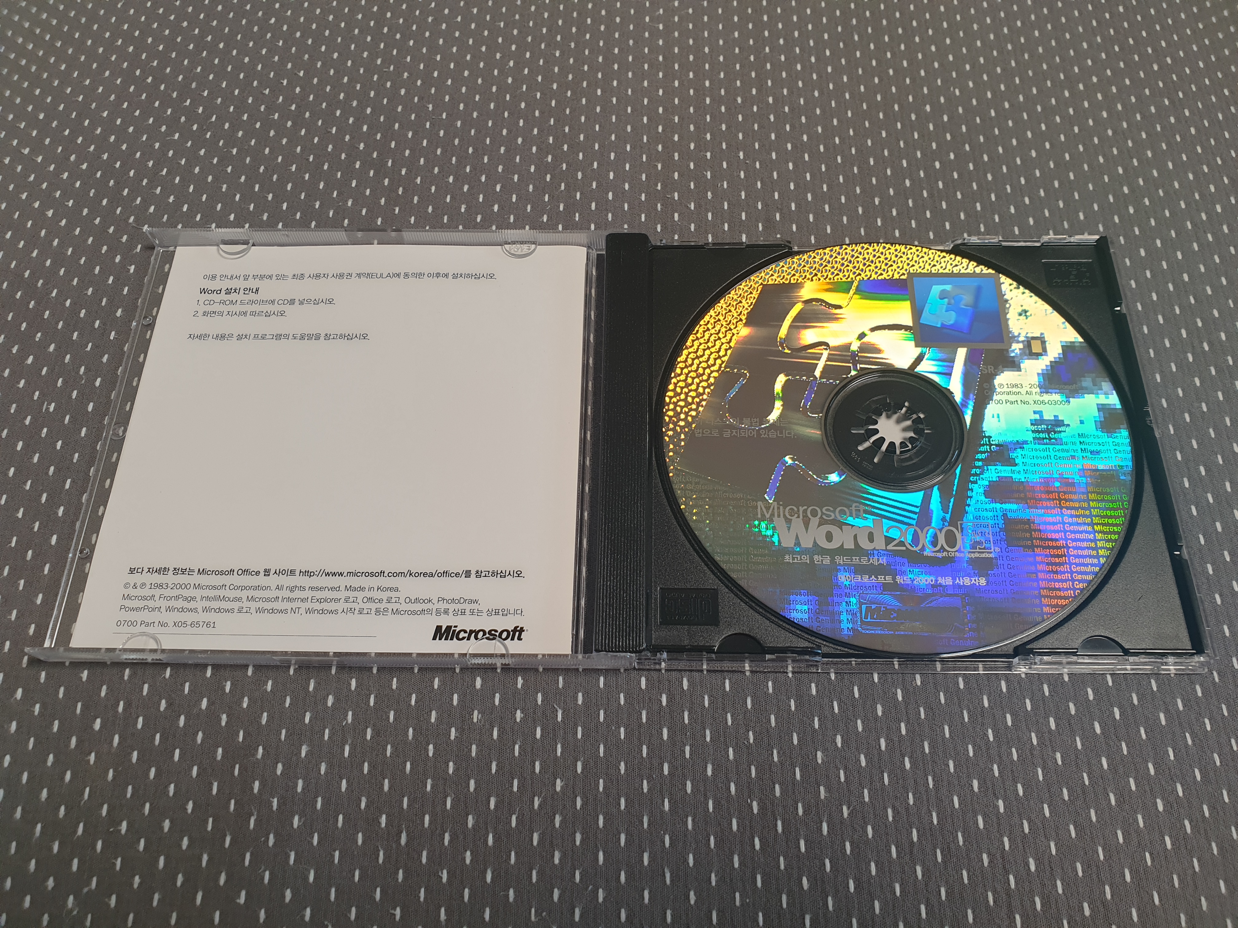 오늘 소개해드릴 소장품은 워드 2000 CD입니다. 마이크로소프트 워드 2000은 마이크로소프트 오피스 2000 중 워드만 단품으로 나온 버전입니다. 이때까지만 해도 자기가 필요한 프로그램만 단품으로 구매하는 사람이 많았습니다. 또 MS가 홍보용으로 워드 단품은 특히 여기저기에 마구 뿌려대기도 했었죠.