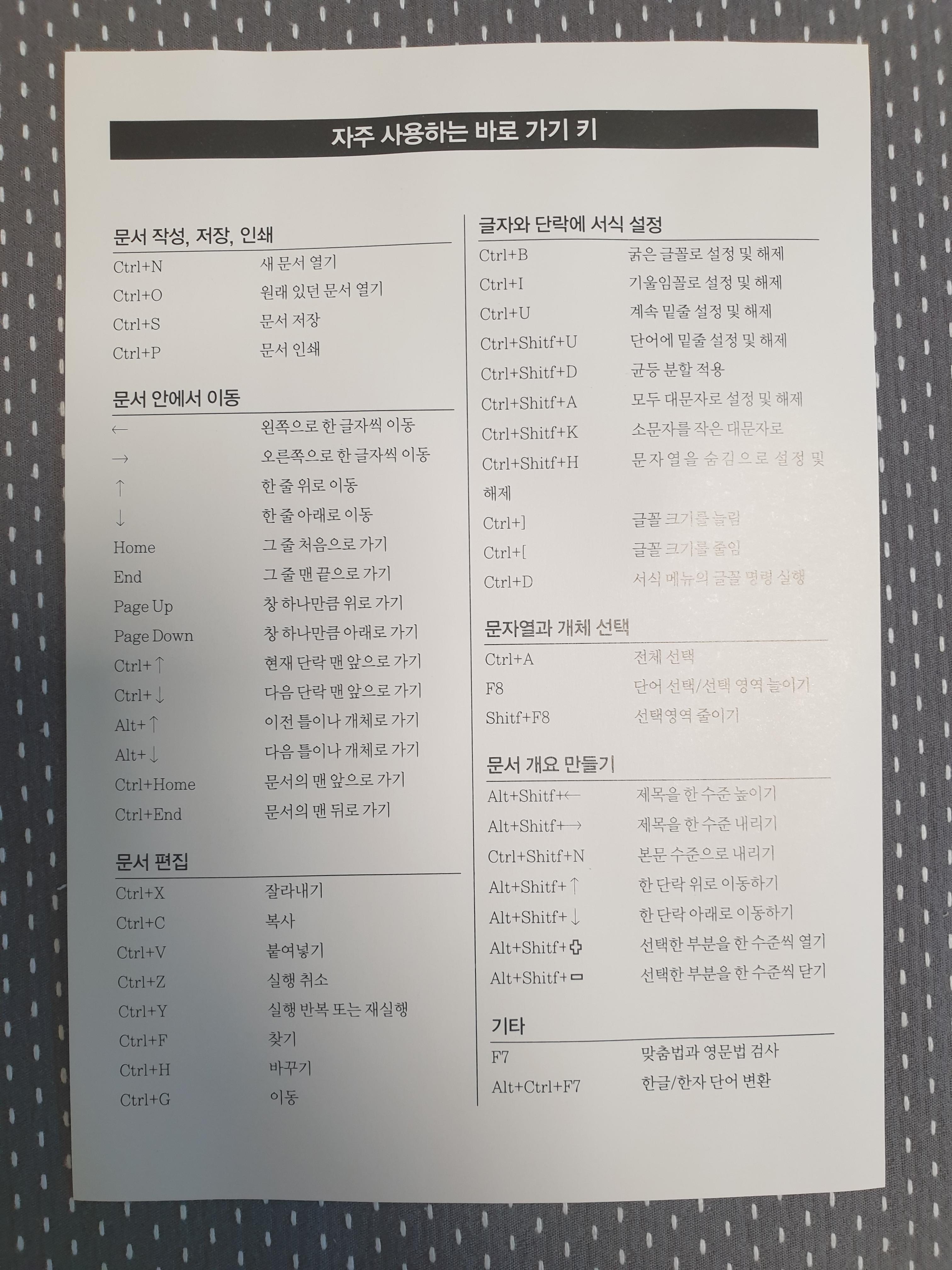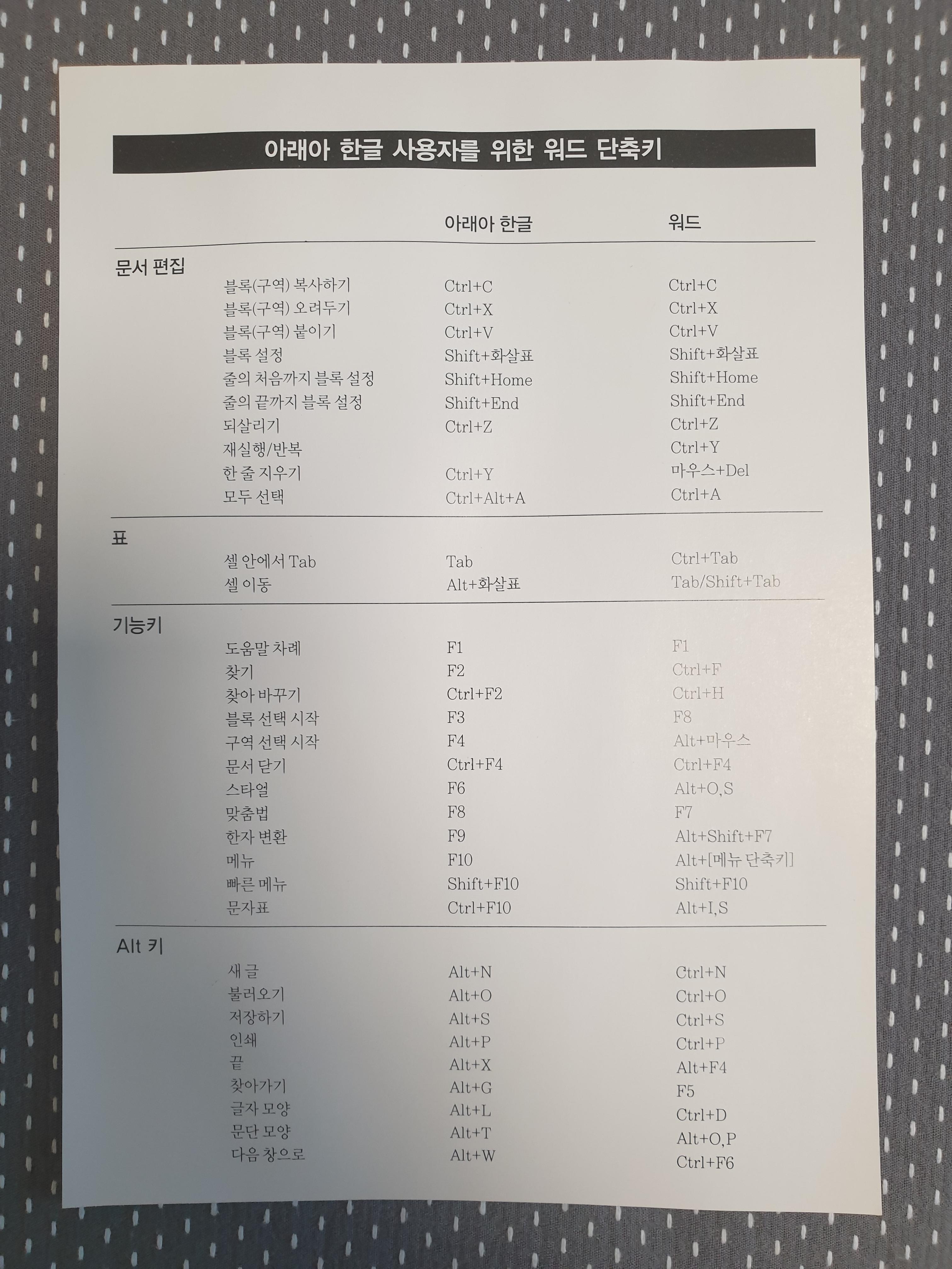 특이하게도 그 뒷면에는 아래아 한글 사용자를 위해 아래아 한글과 워드의 단축키를 비교 정리해놨습니다. 이 당시 MS가 한컴을 무지하게 의식했나 봅니다 ㅋㅋㅋ