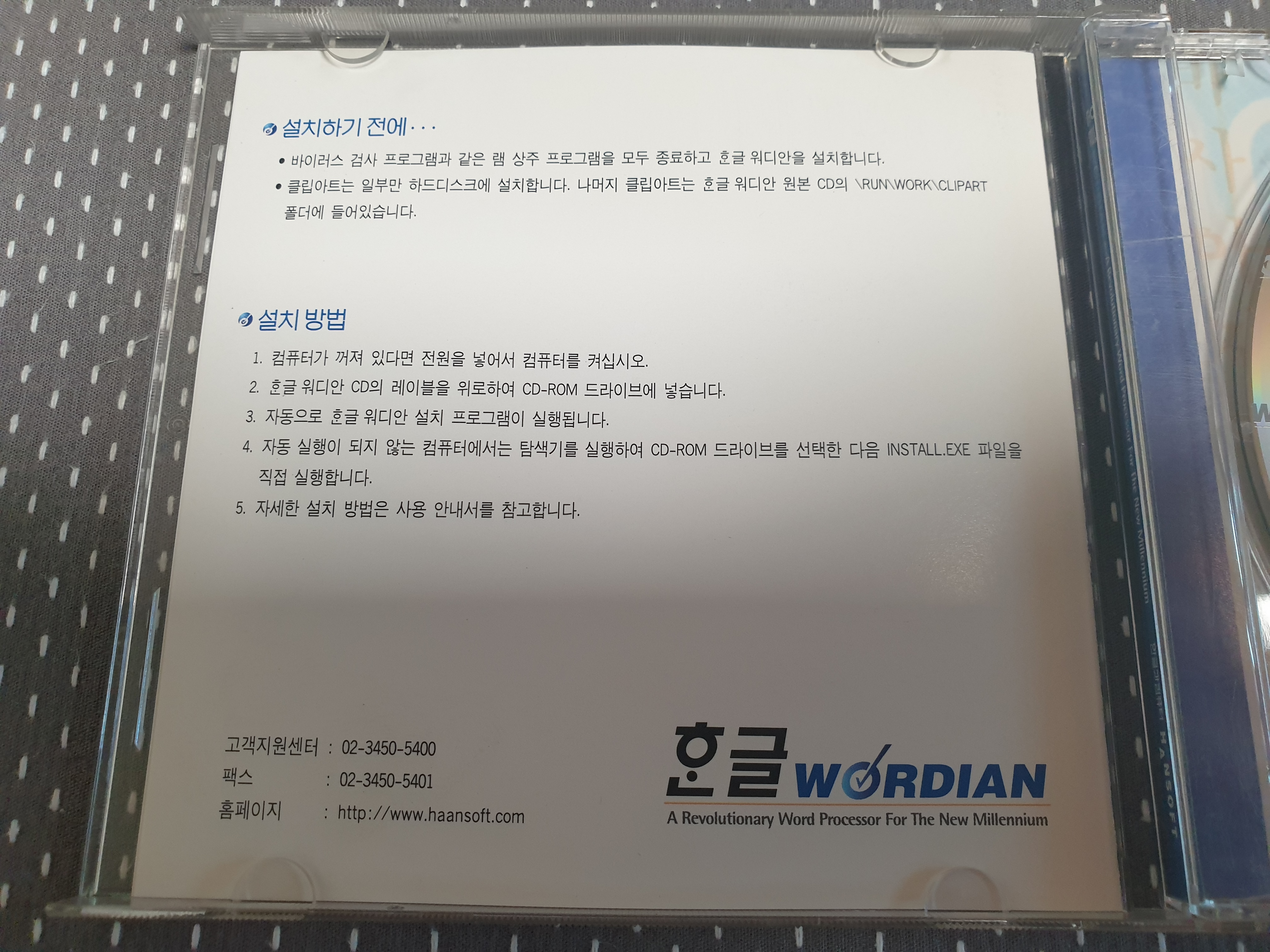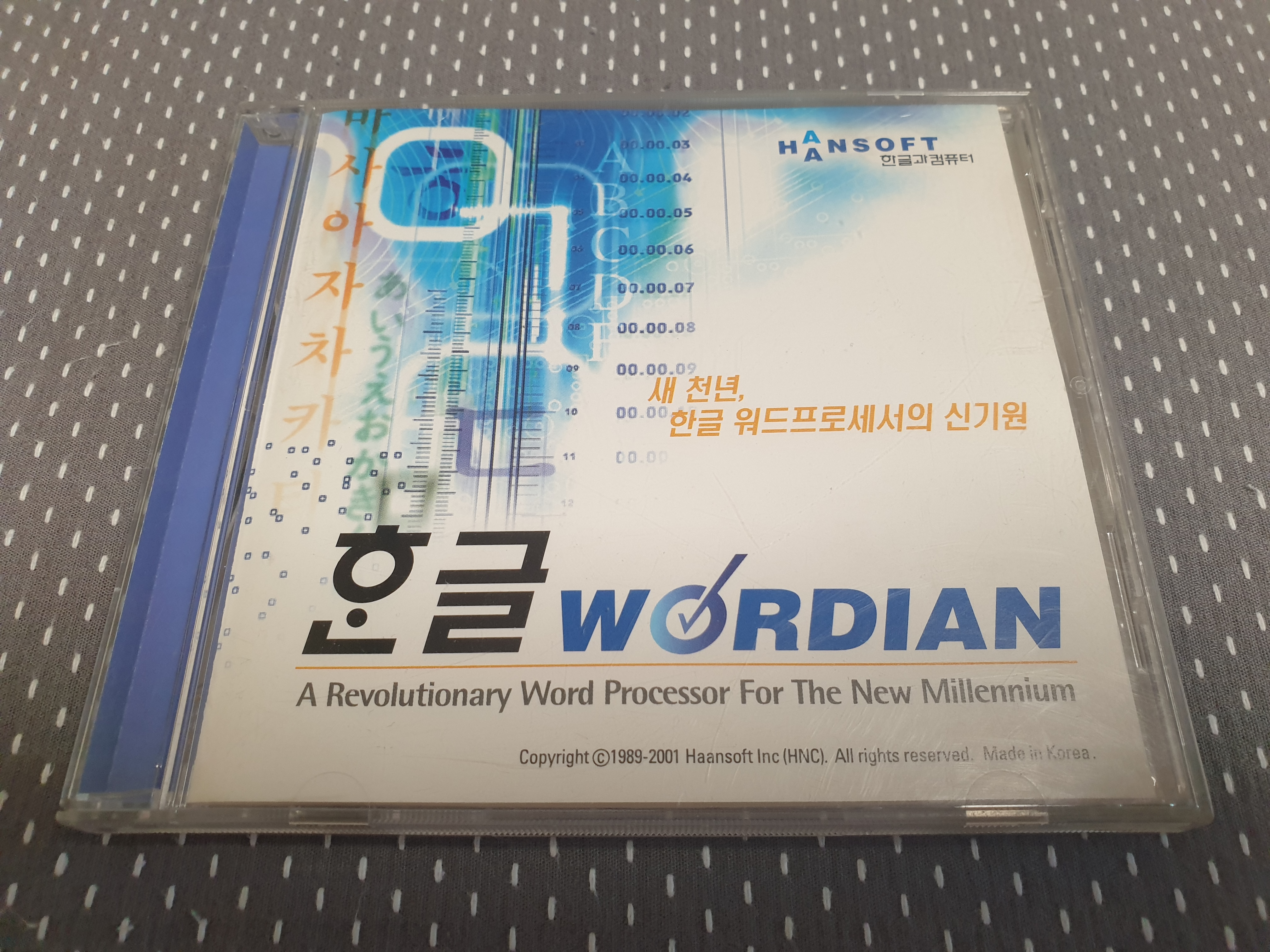 오늘 소개해드릴 소장품은 한글과컴퓨터 한글 워디안 CD입니다. 한글 워디안은 한컴이 2000년 밀레니엄을 맞아 새로운 엔진을 기반으로 출시한 버전입니다. 그러나 이전에 IMF 및 불법복제로 인해 회사가 경영난을 겪던 상황에서 개발해서 그런진 모르겠지만, 수많은 버그들로 인해 제대로 된 정식판이 아닌 시험판을 돈 받고 팔았다는 평가를 들을 정도로 불완전한 버전이었습니다. 사람들은 이전 버전인 한글 97을 다시 사용하였고, 나중에 2002가 출시되자 워디안 사용자들에게는 2002로의 무상 업그레이드가 진행되었습니다. 그만큼 한컴의 흑역사입니다.