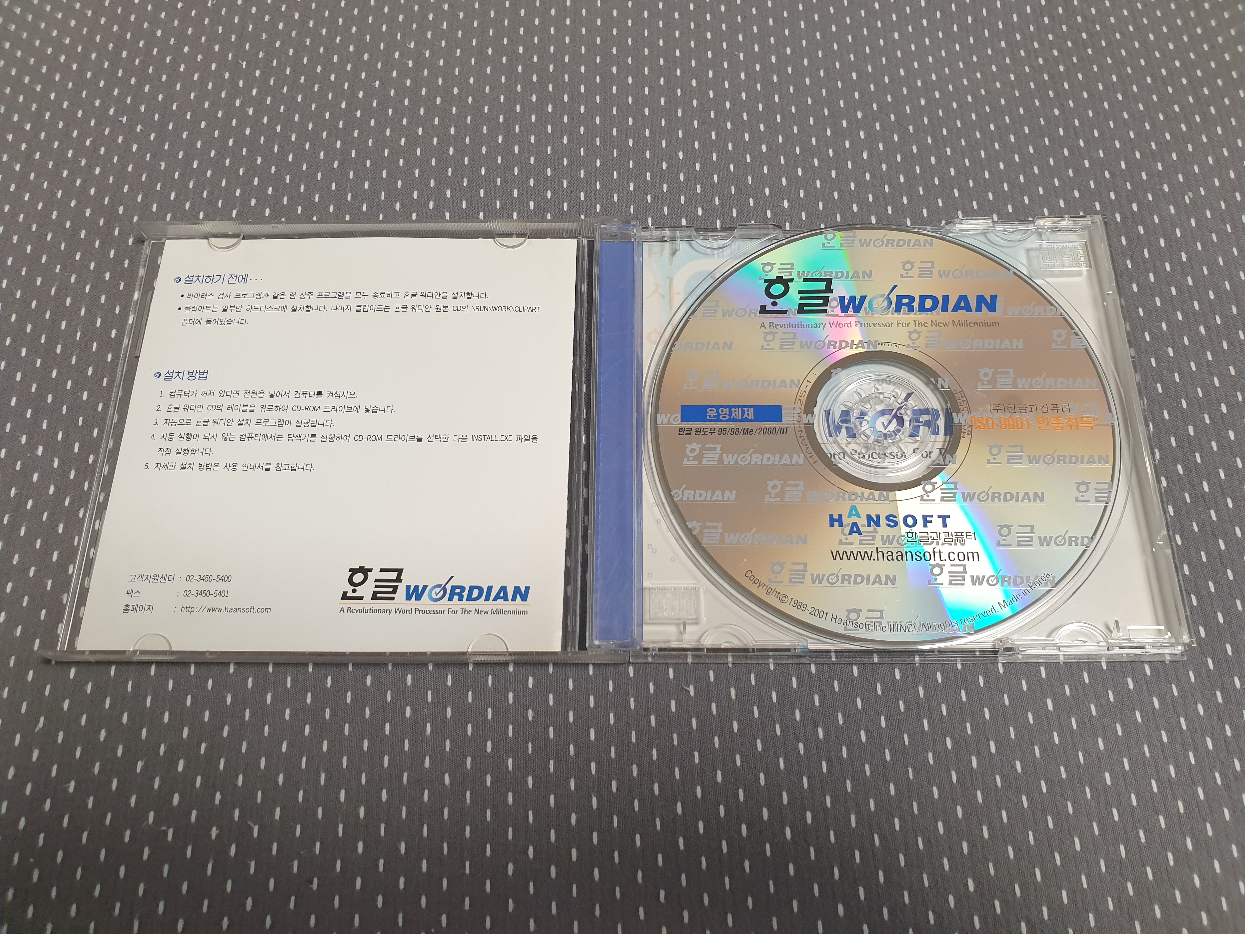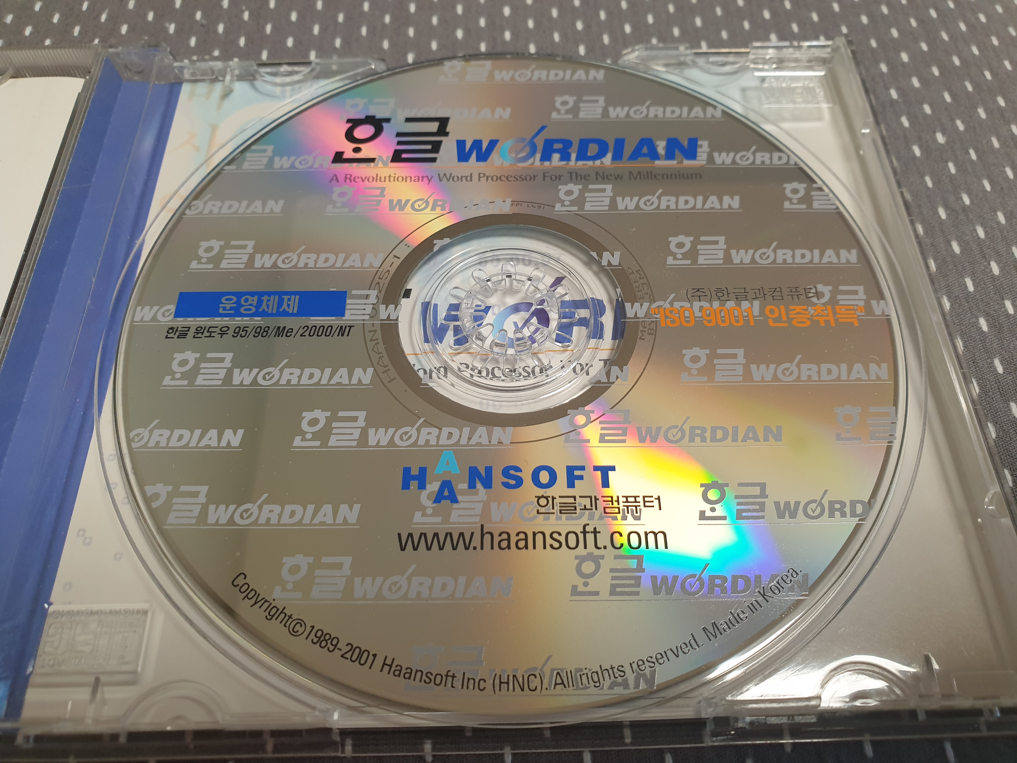 CD의 모습입니다. CD 표면에 한글 워디안 로고가 빼곡히 적혀있습니다. 한글 윈도우 95, 98, Me, 2000, NT와 호환 가능하다고 적혀있습니다. CD 라벨명은 HWPWORDIAN입니다. ISO 9001 인증을 취득하였다고 적혀있는데, ISO 9001은 국제 표준화 기구에서 제정한 품질경영시스템의 국제 표준규격입니다. 한컴이 전반적인 경영 활동에 품질경영시스템을 도입했다는 말입니다. 제가 경영학과라서 아는 게 나왔네요 ㅎ