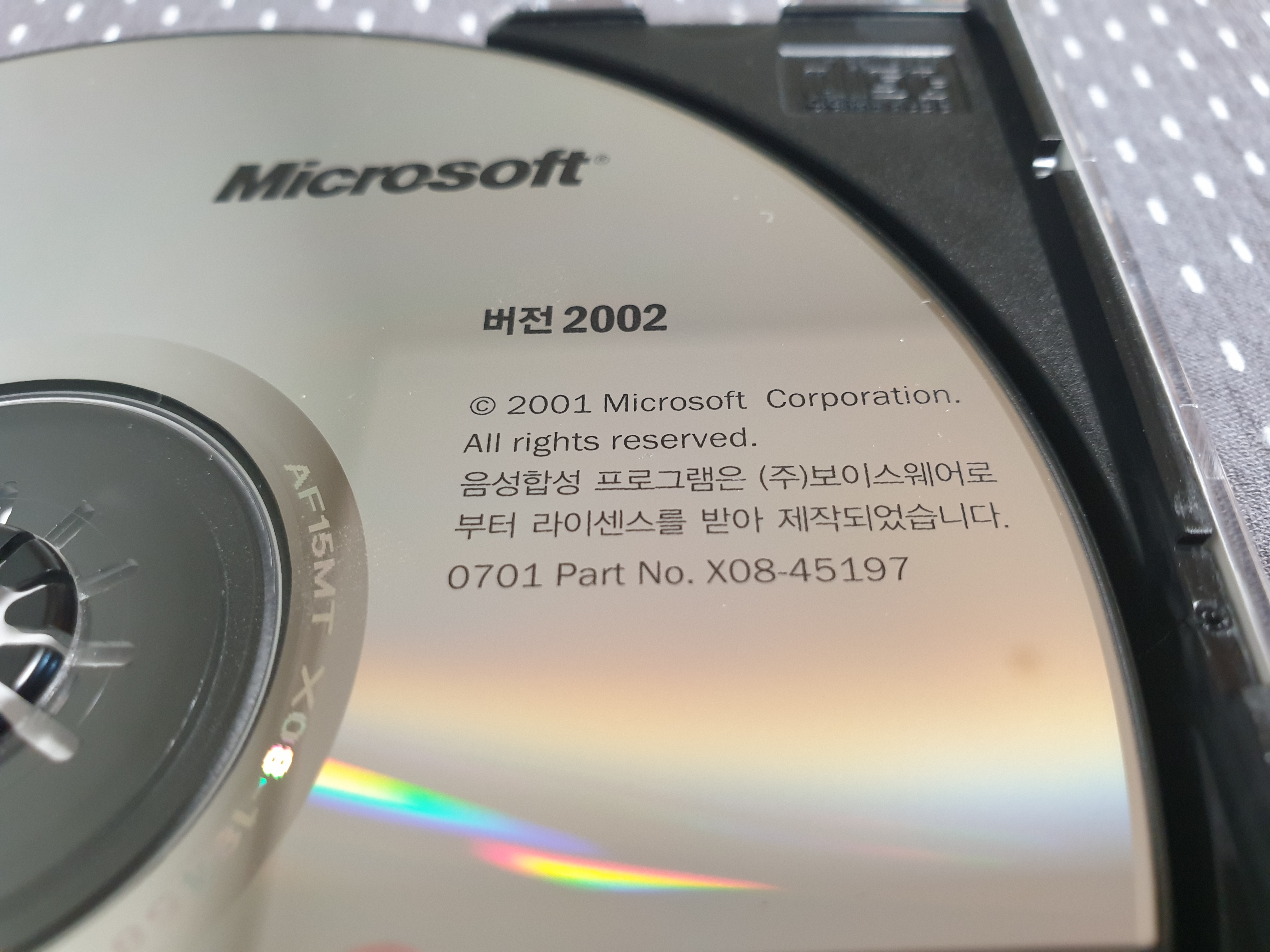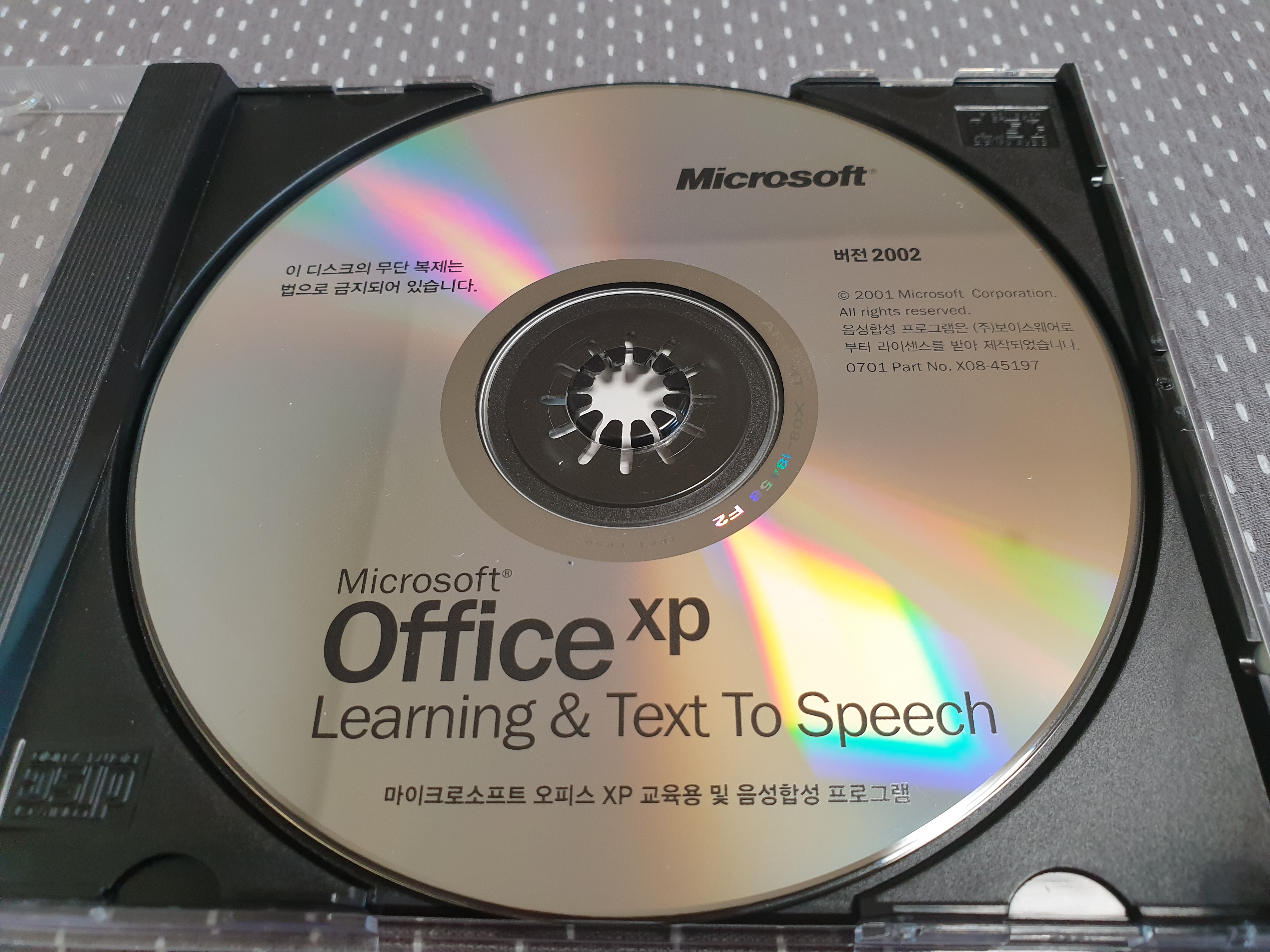 우측 상단을 확대해본 모습입니다. 보이스웨어에서 라이센스를 받아 제작한 음성합성 프로그램이 포함되어 있습니다. 또 설치하면 길라잡이같은 안내 프로그램도 나옵니다. 파트 넘버는 X08-45197이고, CD 라벨명은 OFFICE입니다.