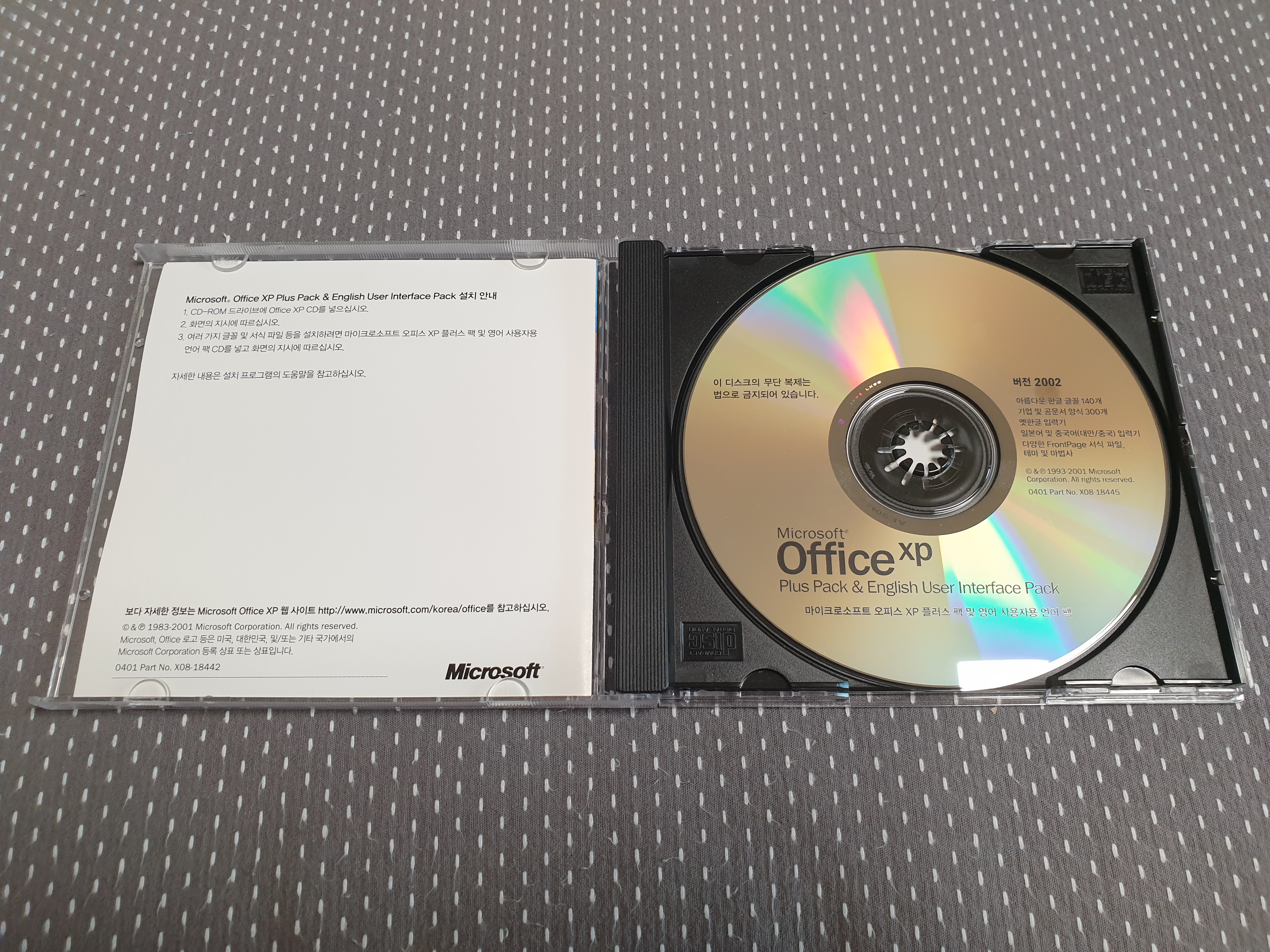 오늘 소개해드릴 소장품은 마이크로소프트 오피스 XP CD입니다. 오피스 XP는 2001년 윈도우 XP보다 조금 먼저 출시되었습니다. 오피스 2002라는 이름으로도 많이 알려져 있습니다만, 이전에 나온 오피스 2000과 이후에 나온 오피스 2003 사이에 껴서 생각보다 널리 쓰이진 않은 버전입니다.