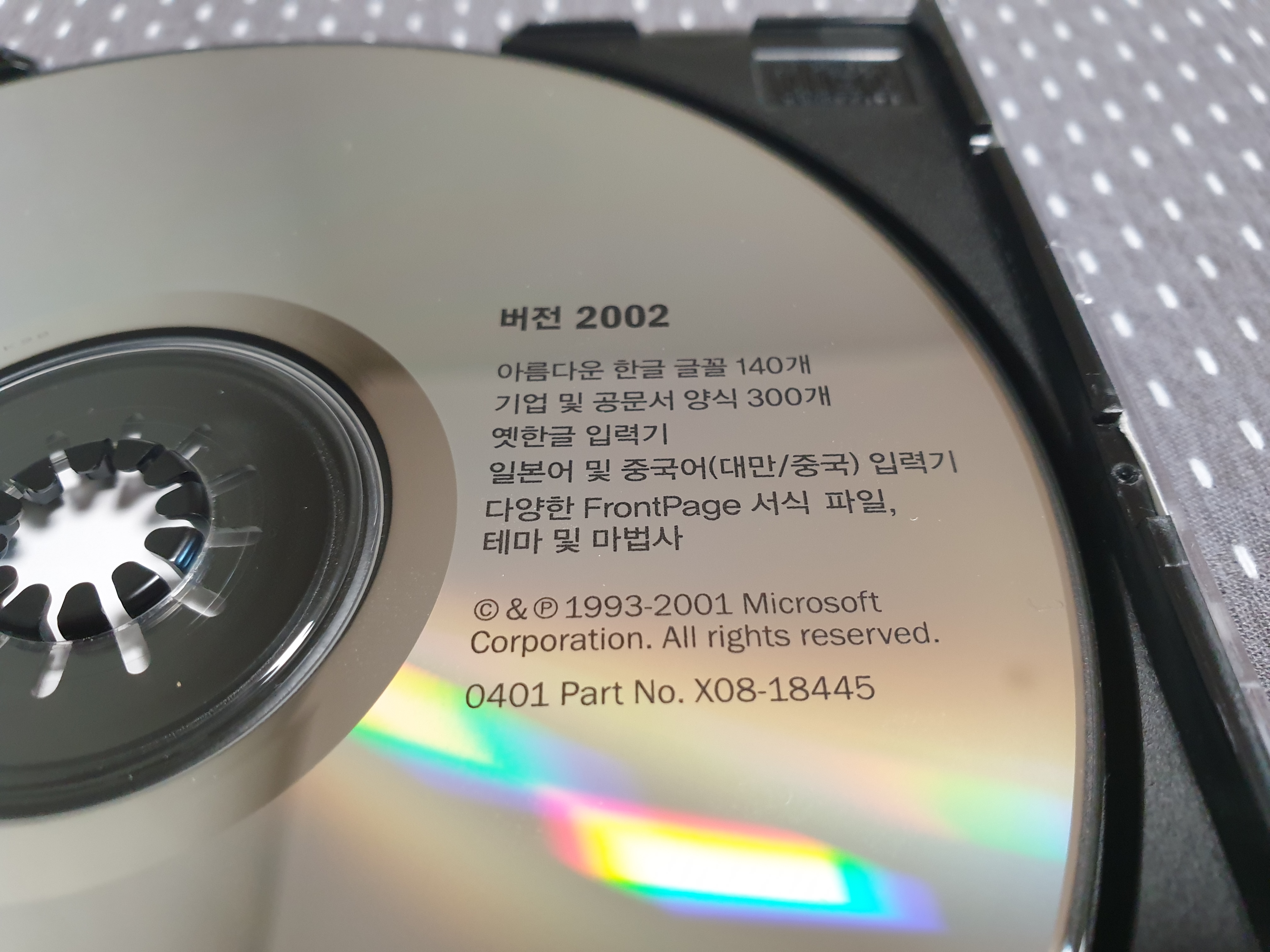 우측 상단을 확대해본 모습입니다. 아름다운 한글 글꼴 140개, 기업 및 공문서 양식 300개, 옛한글 입력기, 일본어 및 중국어(대만/중국) 입력기, 다양한 프론트페이지 서식 파일, 테마 및 마법사가 포함되어 있다고 합니다. 오피스 2000 플러스 팩의 구성과 비슷하네요. 파트 넘버는 X08-18445이고, CD 라벨명은 PLUSPACK입니다.