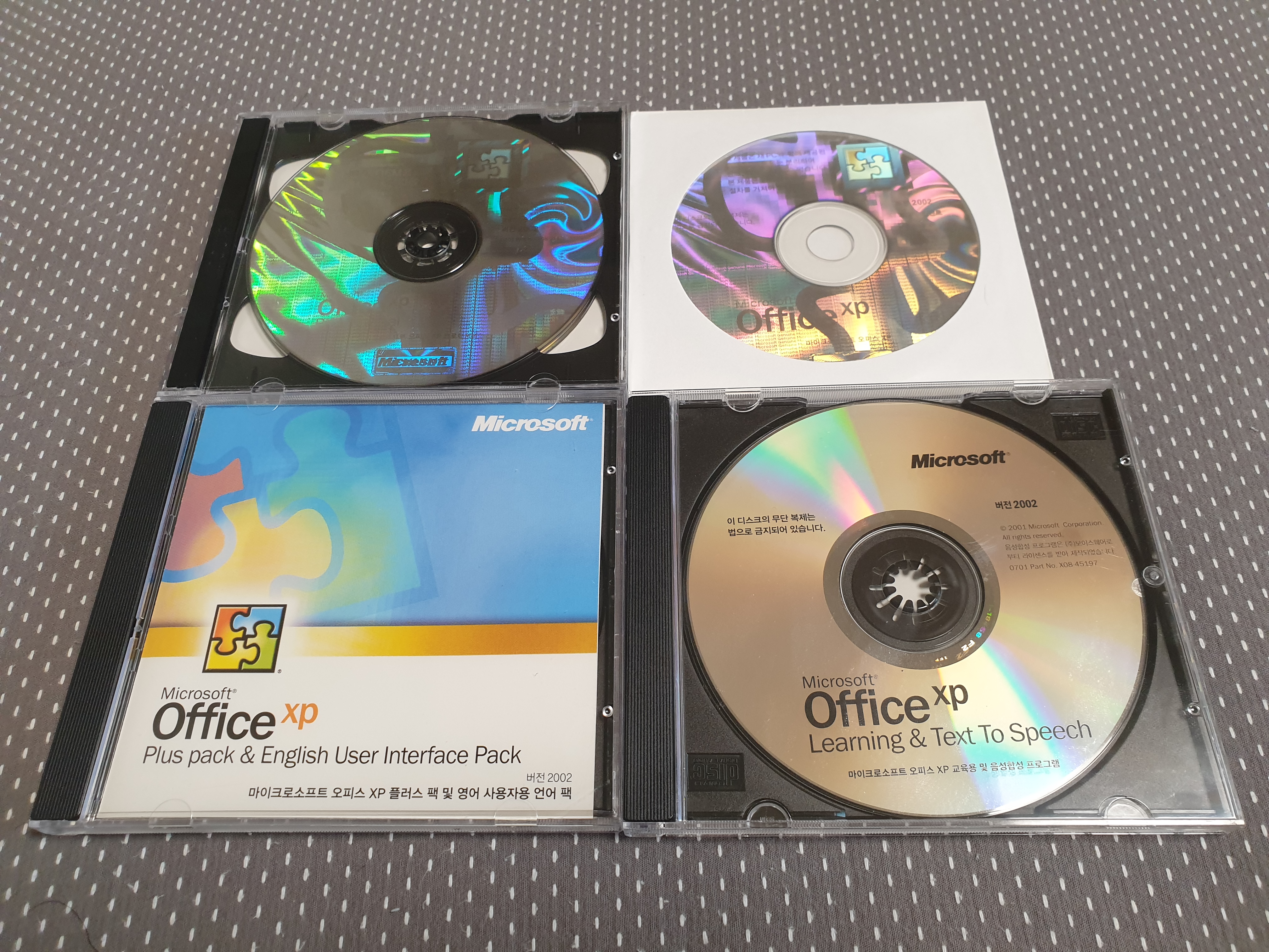 제가 가지고 있는 CD는 오피스 XP, 미디어 컨텐트, 플러스 팩 및 영어 사용자용 언어 팩, 교육용 및 음성합성 프로그램 이렇게 있습니다. 모두 중고장터에서 구입했습니다.