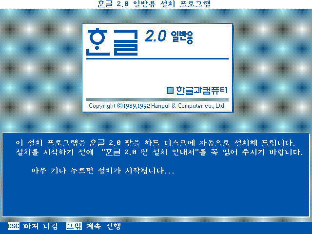 한글과컴퓨터 한글 2.0 일반용을 설치해보았습니다. 한글 1.x 버전에서 2.x대로 넘어오면서 아래아 한글에는 많은 기능이 추가됩니다. 표 기능, 윤곽선 글꼴을 비롯해서 이미지 삽입도 제대로 지원하게 되었습니다. 이때부터 지금까지 사용하고 있는 한글의 많은 단축키들이 성립되기 시작했습니다. 그 첫 버전인 한글 2.0, 그 중에서도 일반용을 설치해보았습니다.