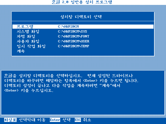 한글이 설치될 디렉토리를 보여줍니다. 계속을 선택합니다.