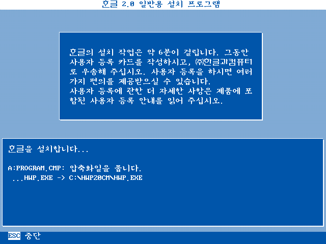 한글 2.0판의 설치가 끝났습니다. 도스로 돌아갑니다.