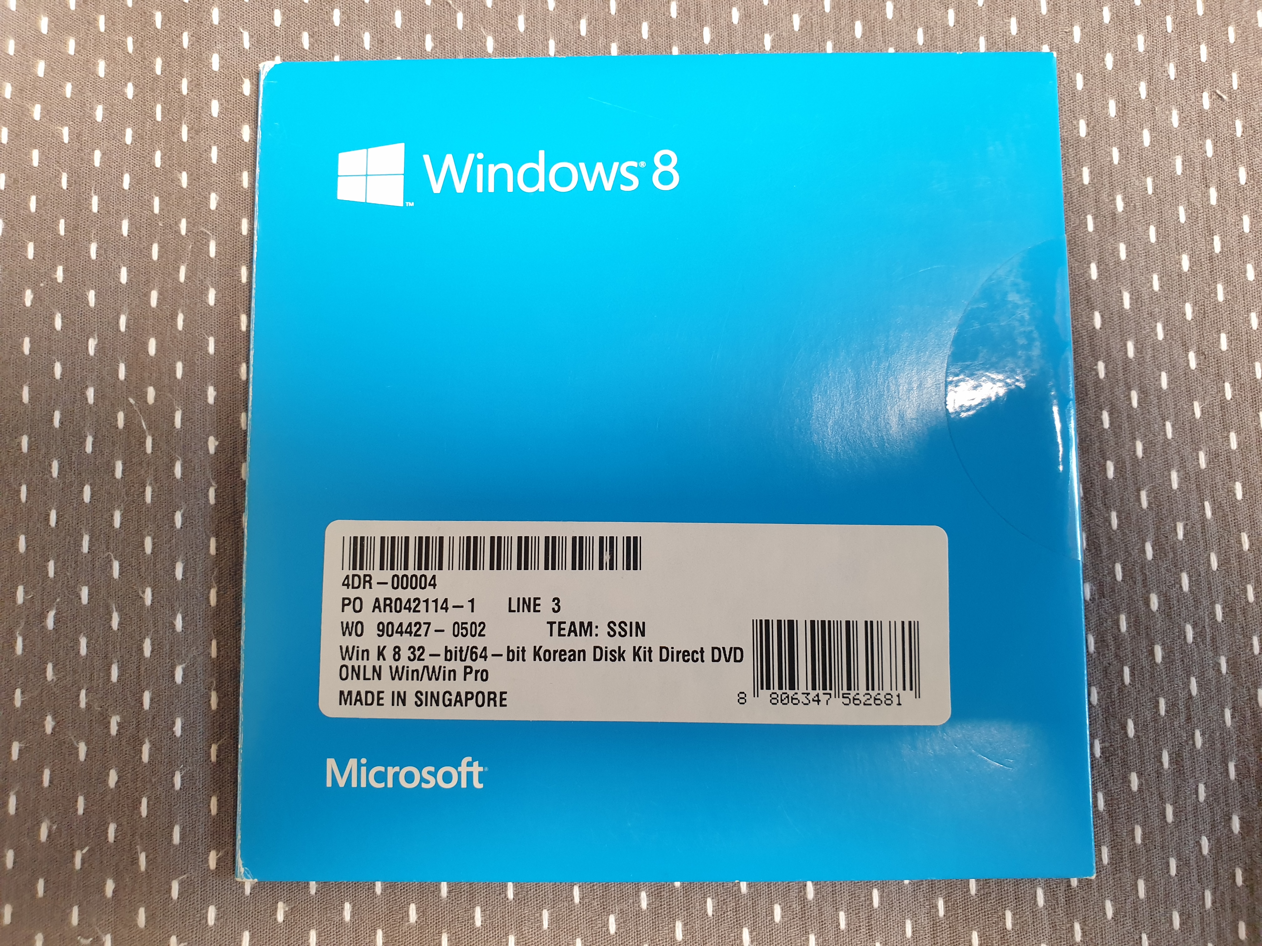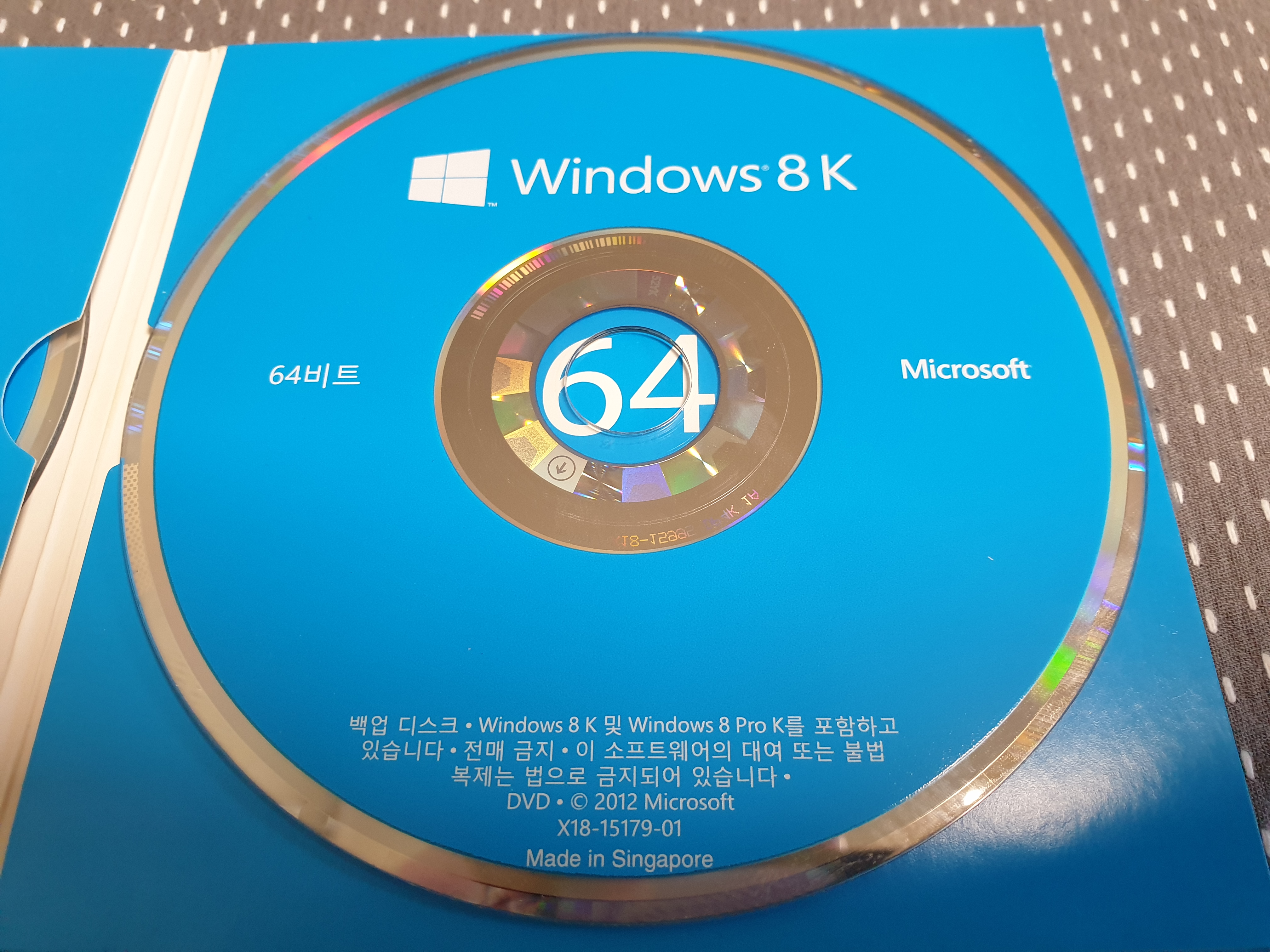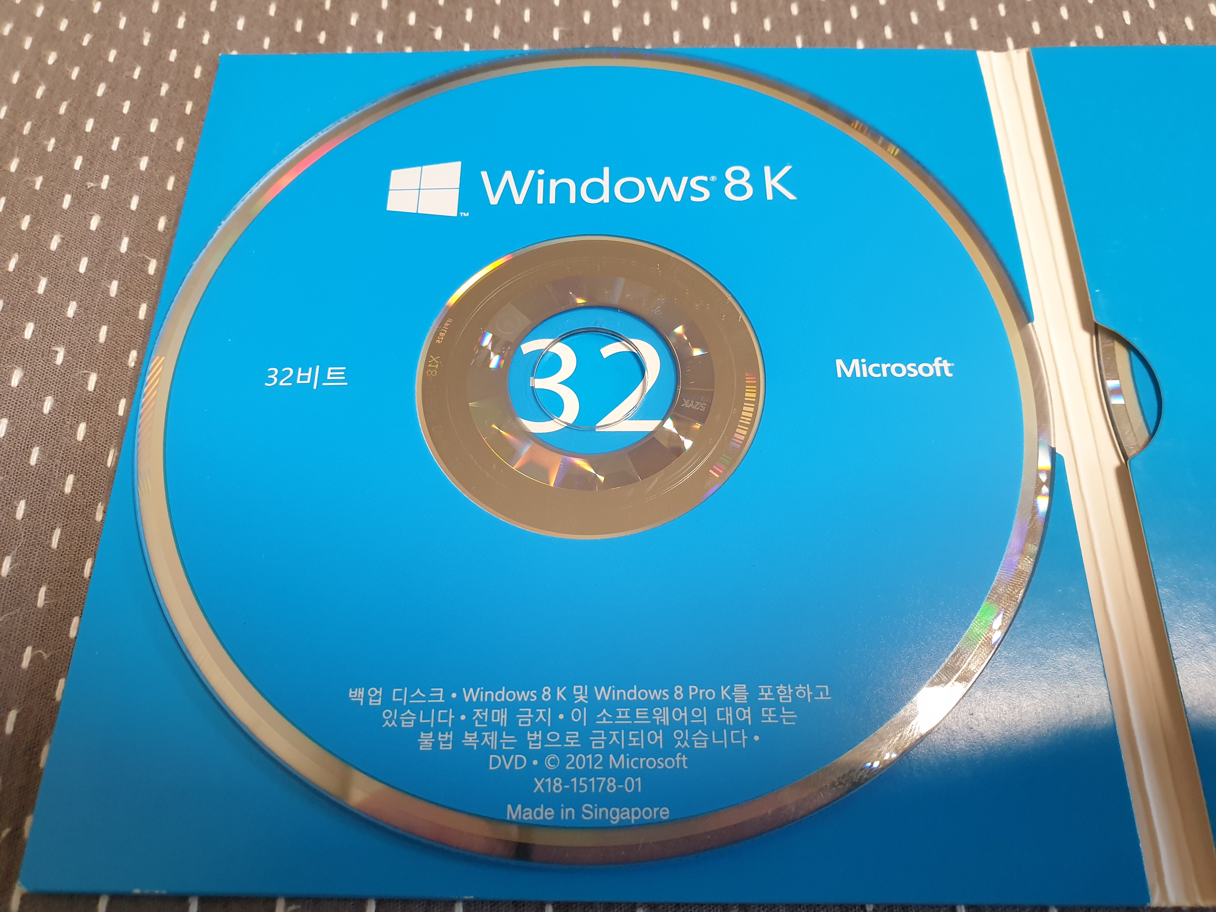 윈도우 8 DVD 케이스입니다. 아주 얇은 종이 케이스에 32비트와 64비트 DVD 두 장이 들어있습니다. 앞면에는 바코드와 상품 이름이 적혀있습니다. 한글판 디스크이며, 싱가포르에서 제조되었다고 적혀있습니다. 이 DVD는 제가 마이크로소프트에서 직접 구입한 것입니다.