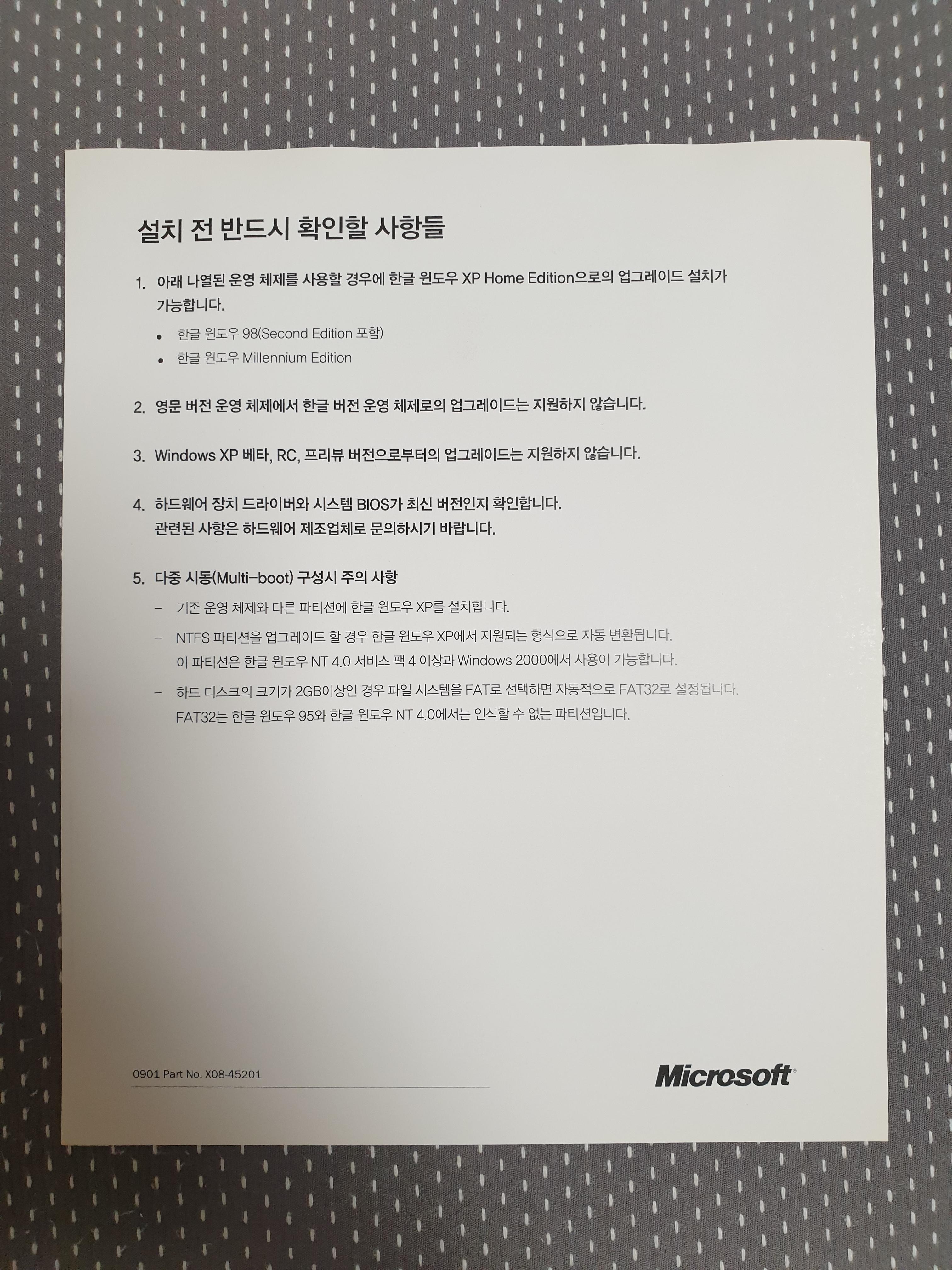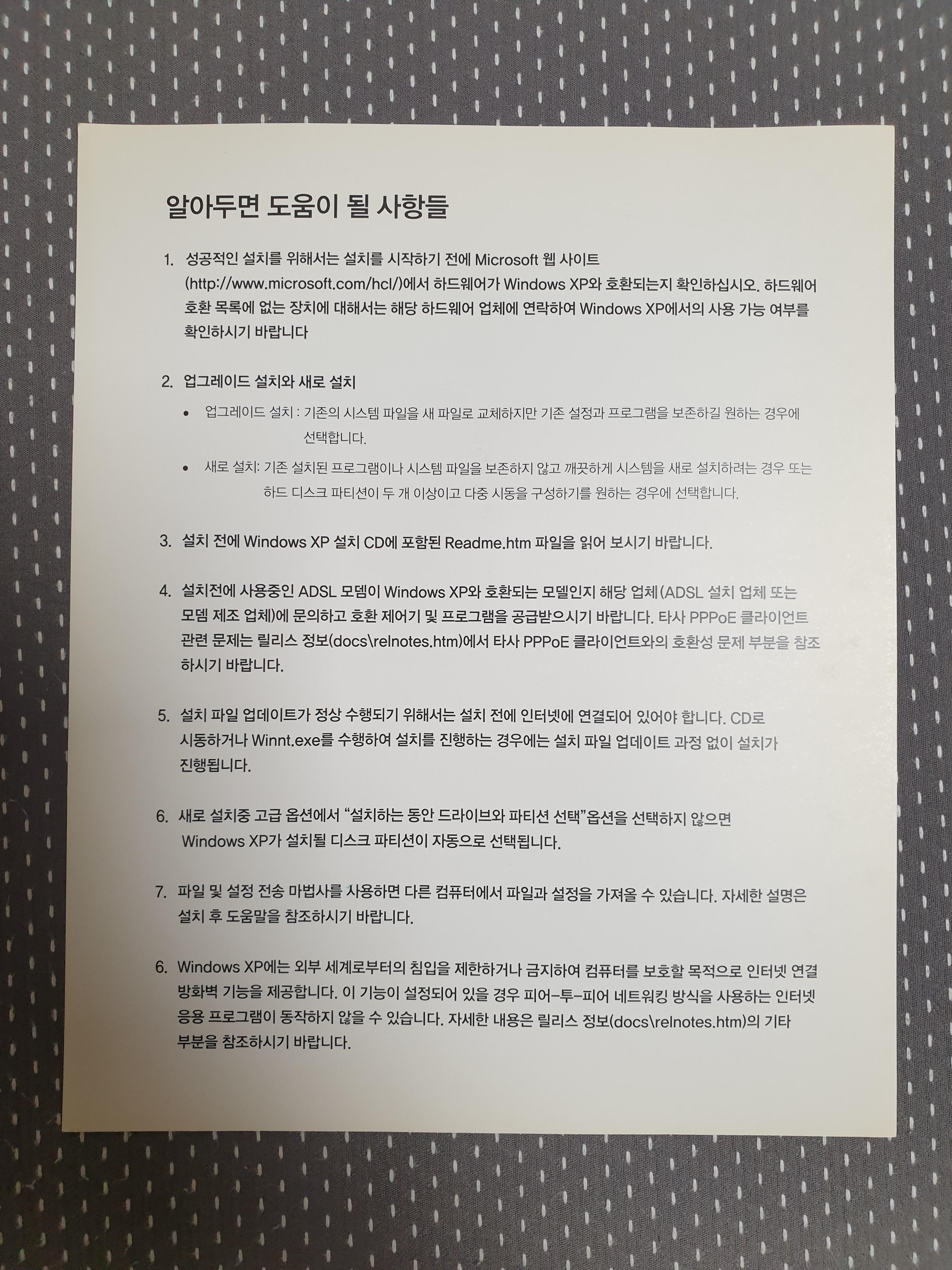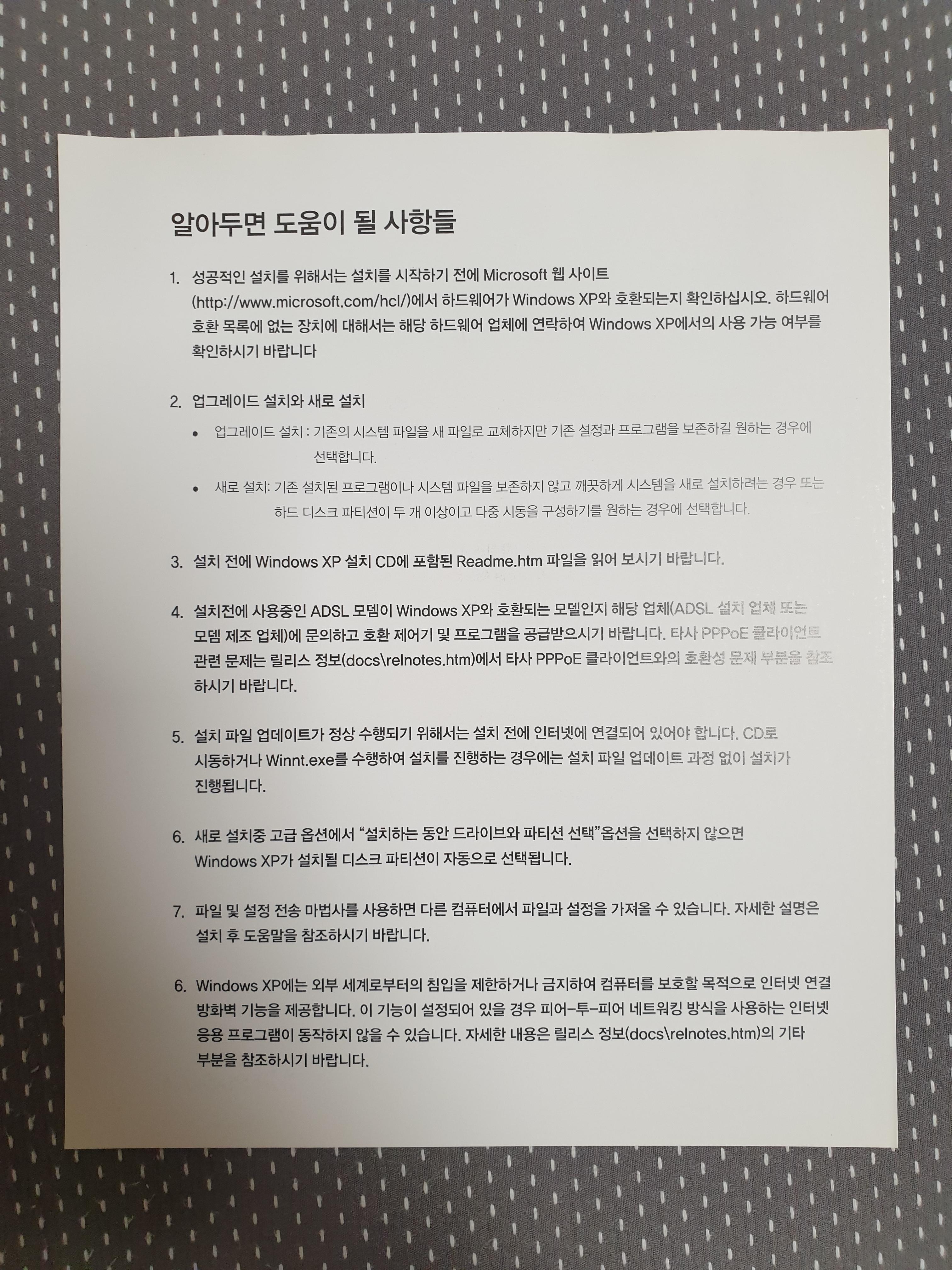 윈도우 XP 설치 시 알아두면 도움이 될 사항들이 적힌 종이입니다. 처음 윈도우를 설치하는 사람들에게는 유용하죠.