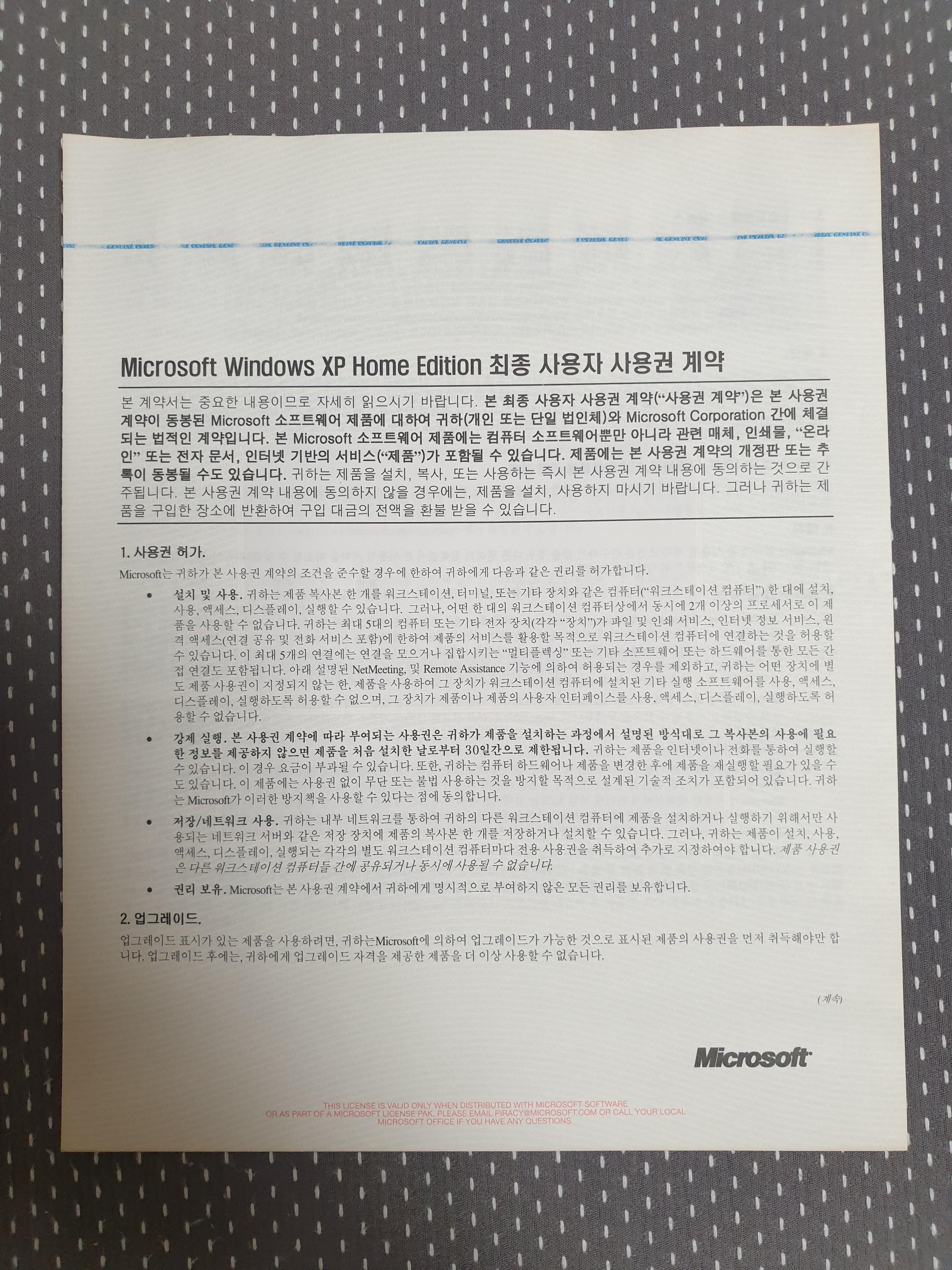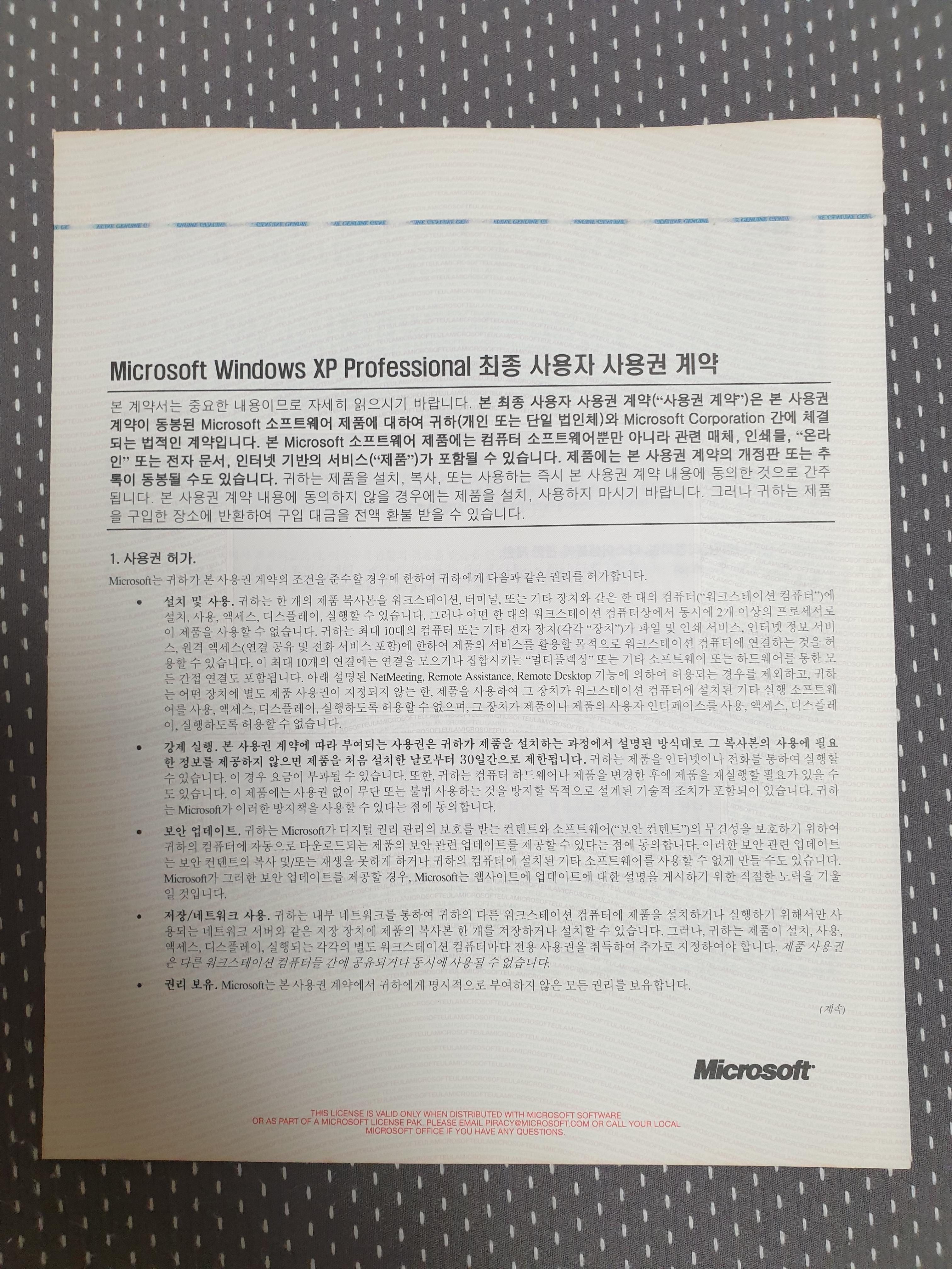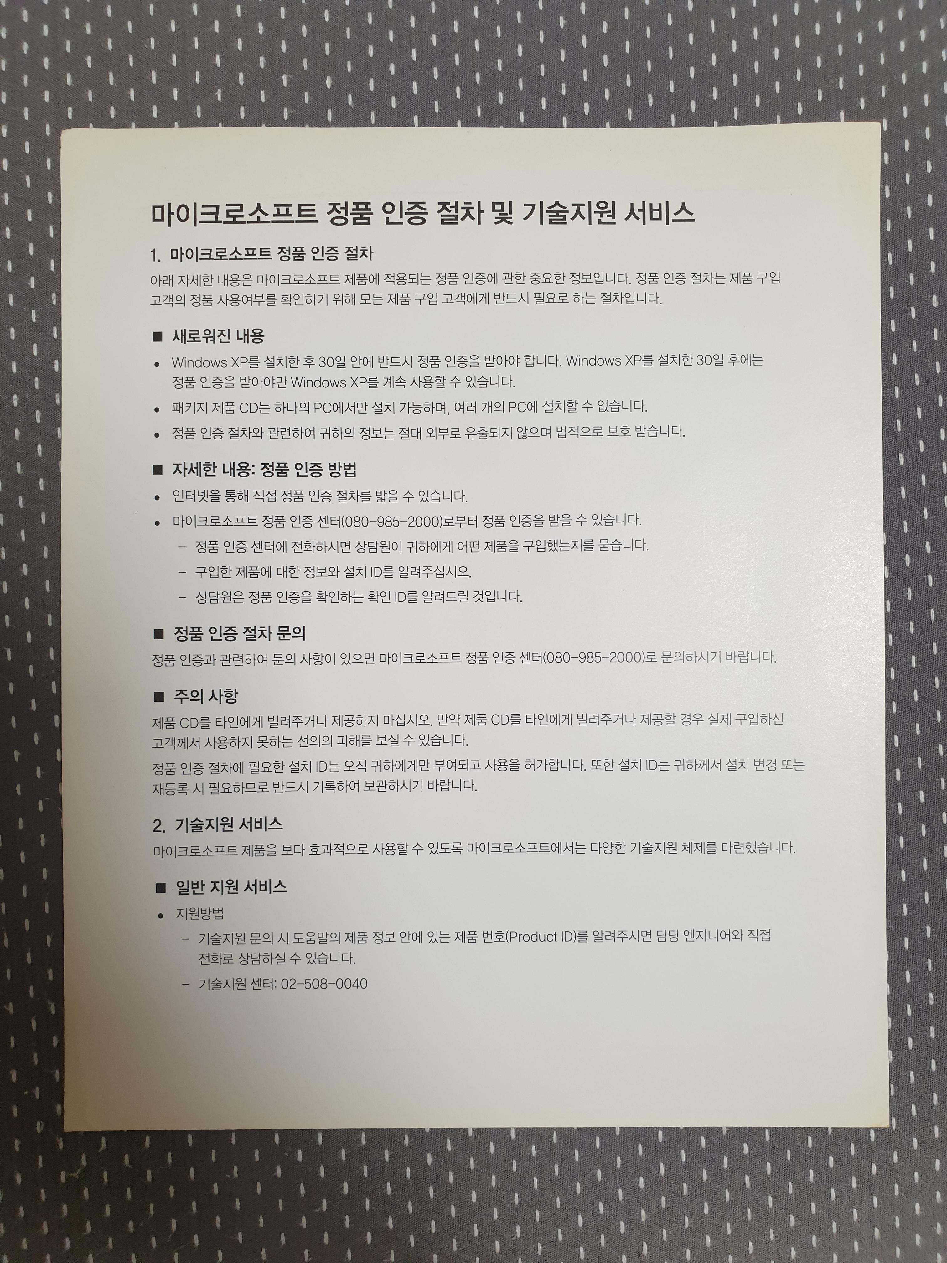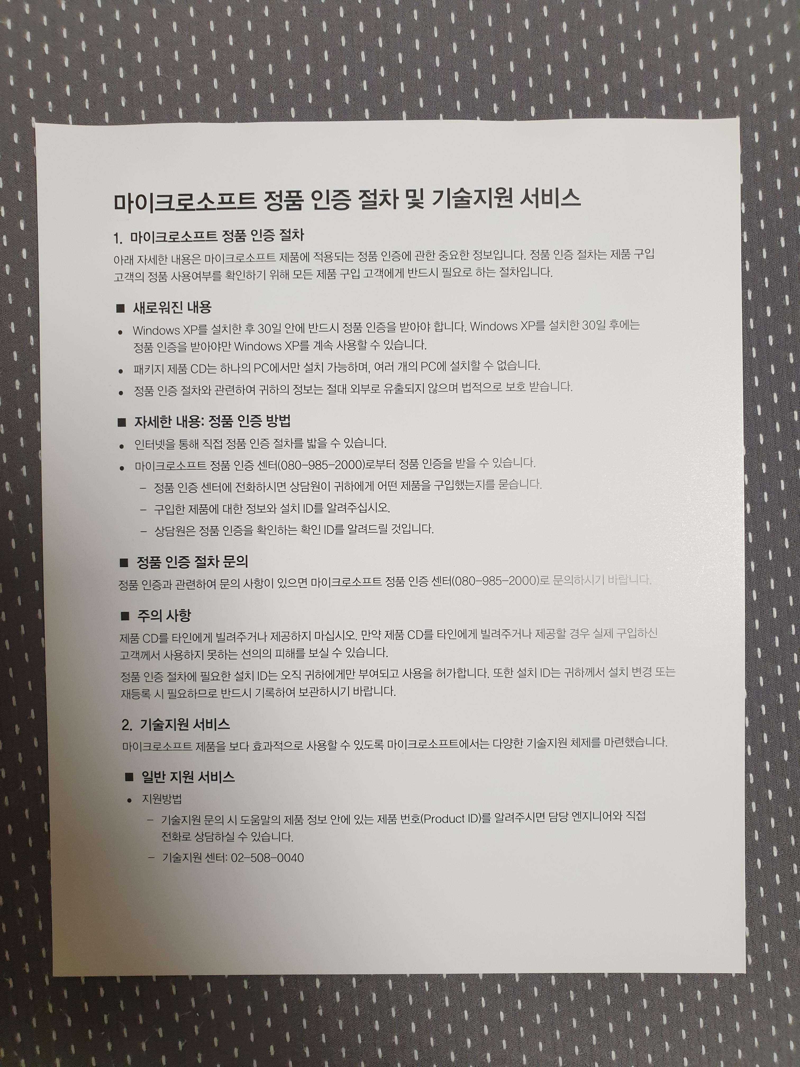 마이크로소프트 정품 인증 절차 및 기술지원 서비스에 관한 내용이 적힌 종이입니다.