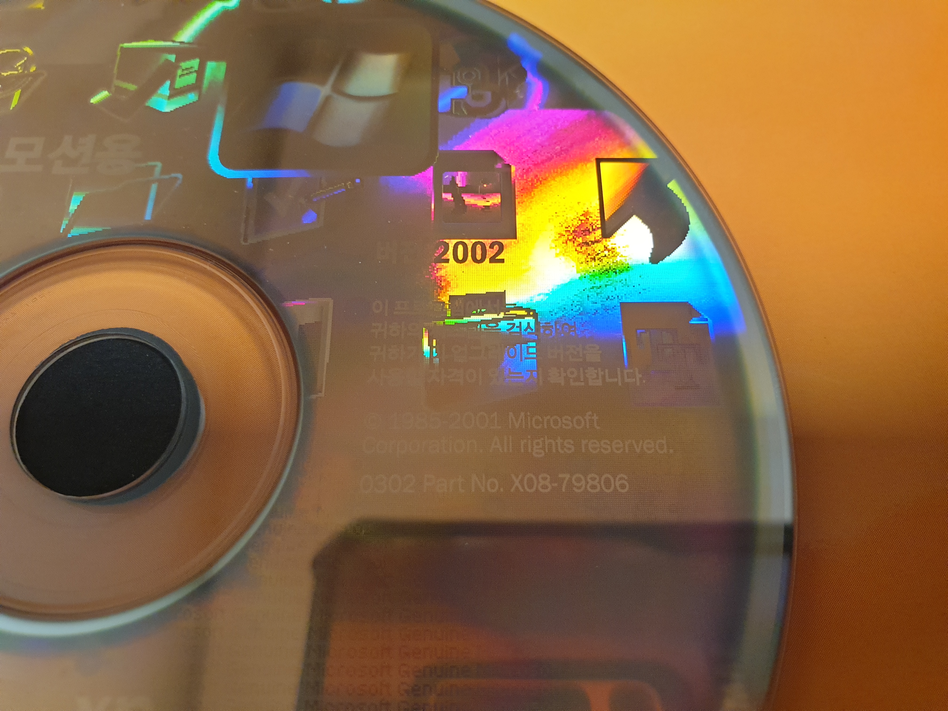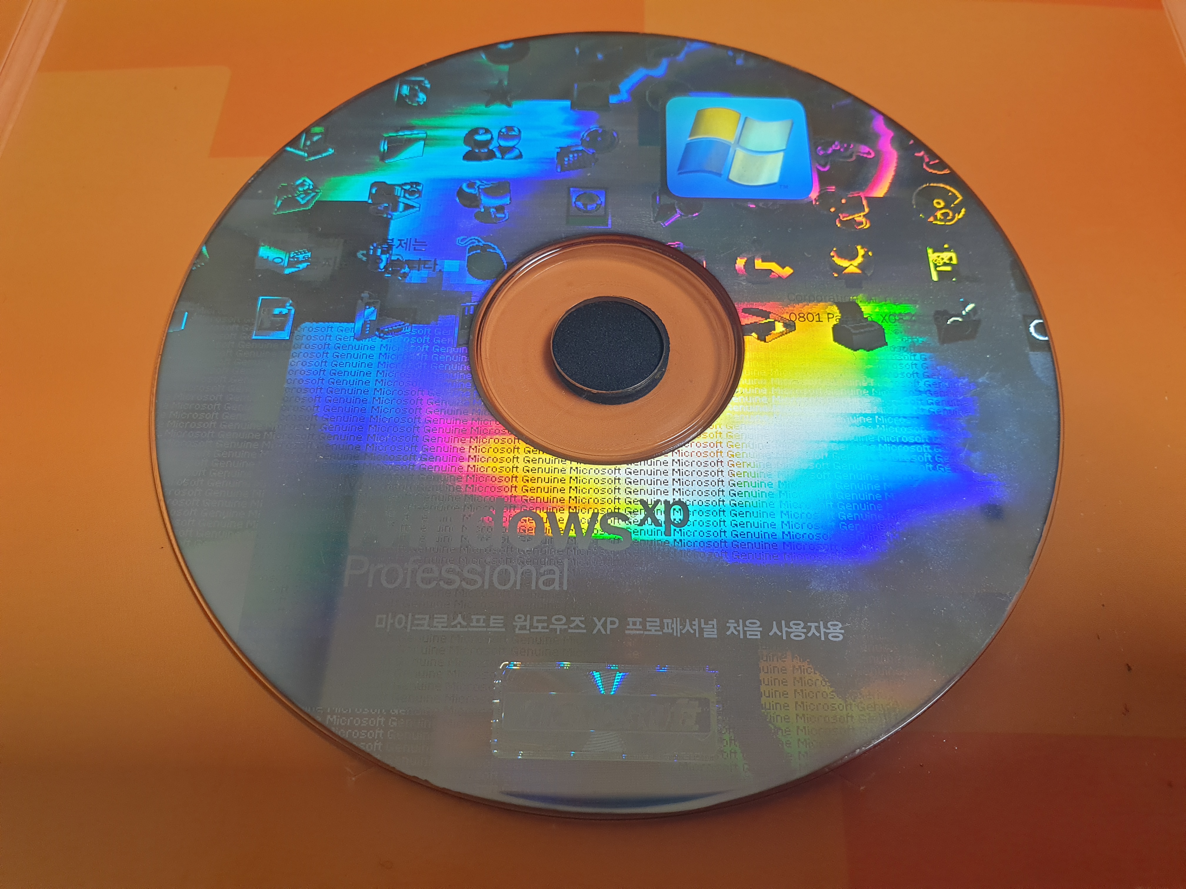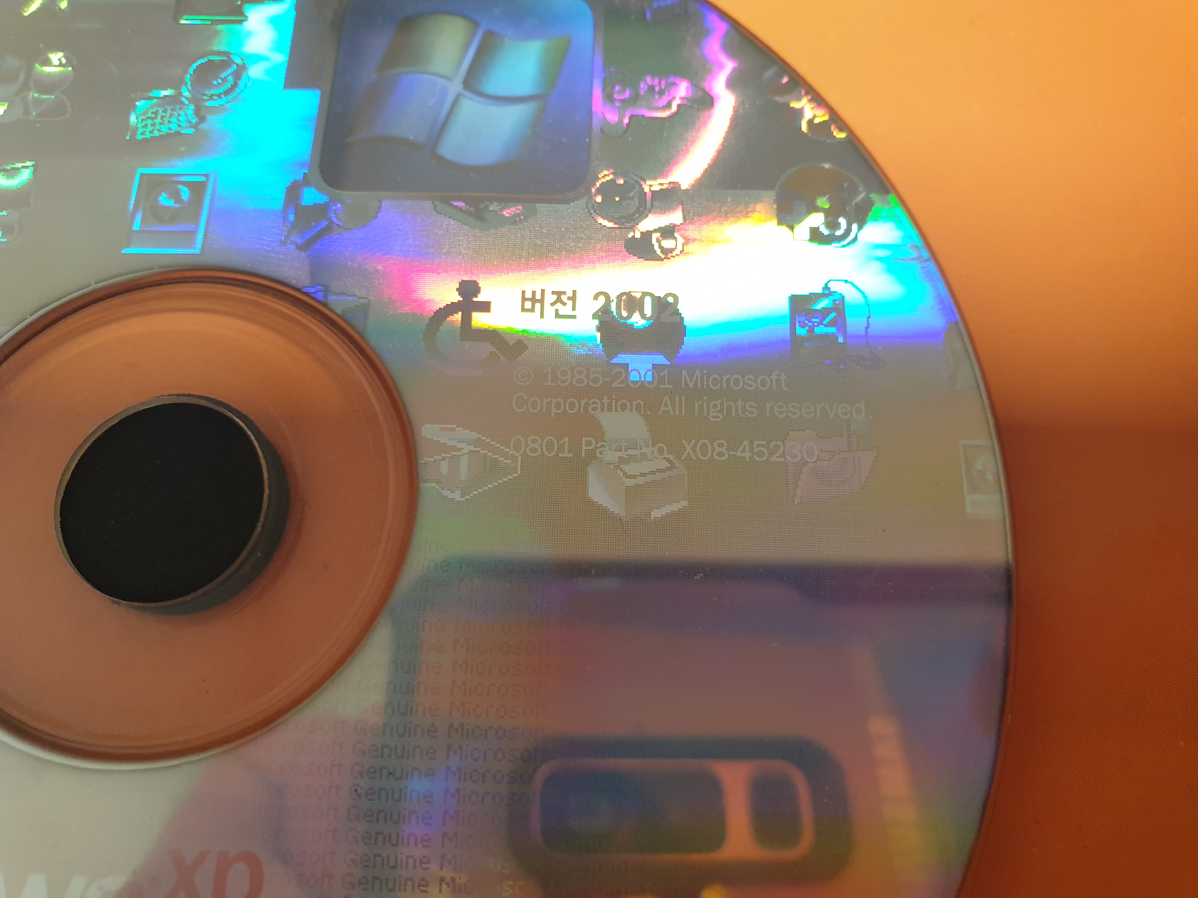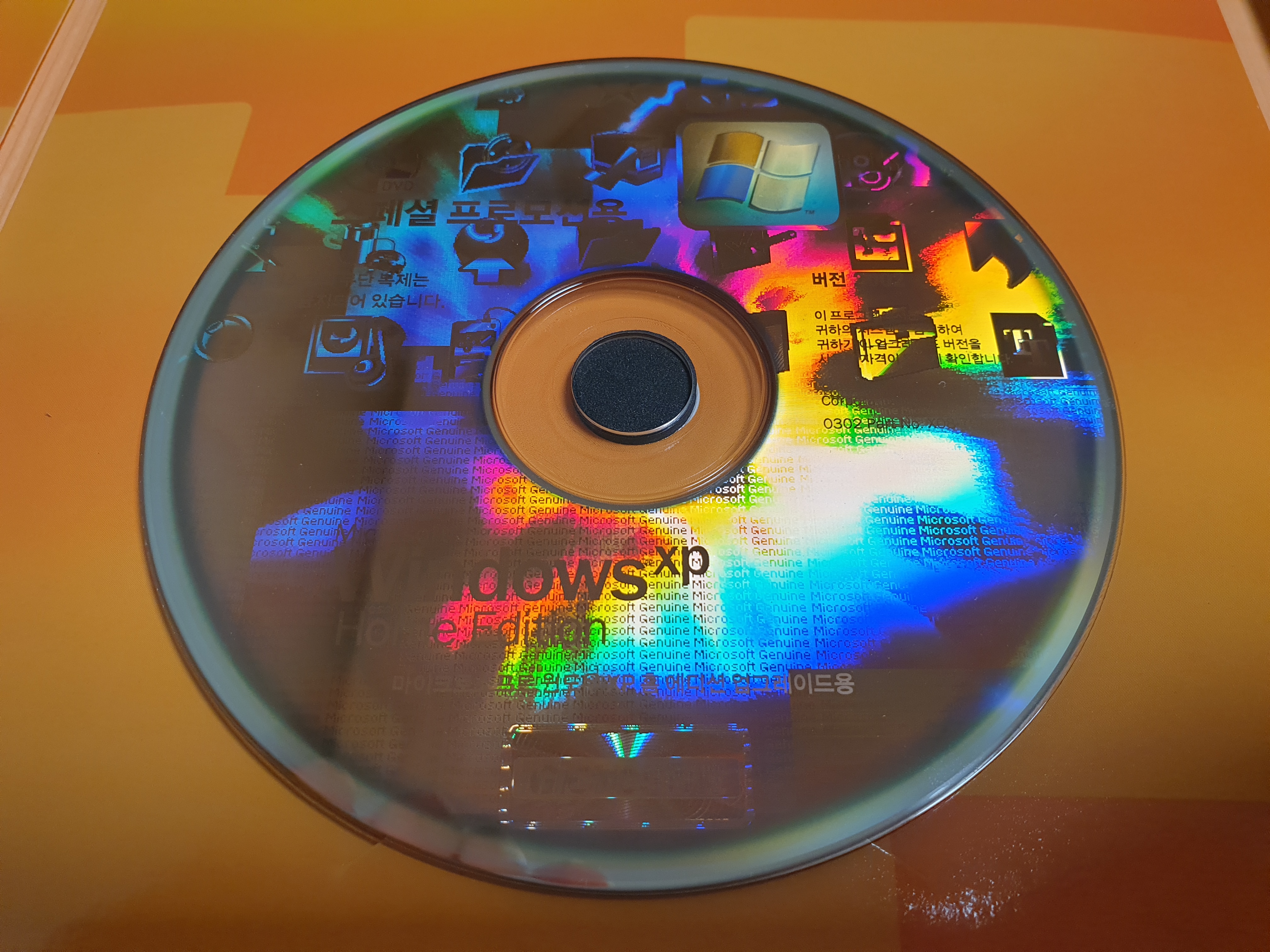 CD의 모습입니다. 이전의 XP CD 소개글에서 소개해드렸던 XP 프로페셔널 SP2 버전은 CD 바탕색이 주황색이었는데, 무서팩 초기 버전은 이렇게 은색입니다. 물론 각종 아이콘으로 도배된 홀로그램은 똑같습니다. 처음 사용자용입니다.