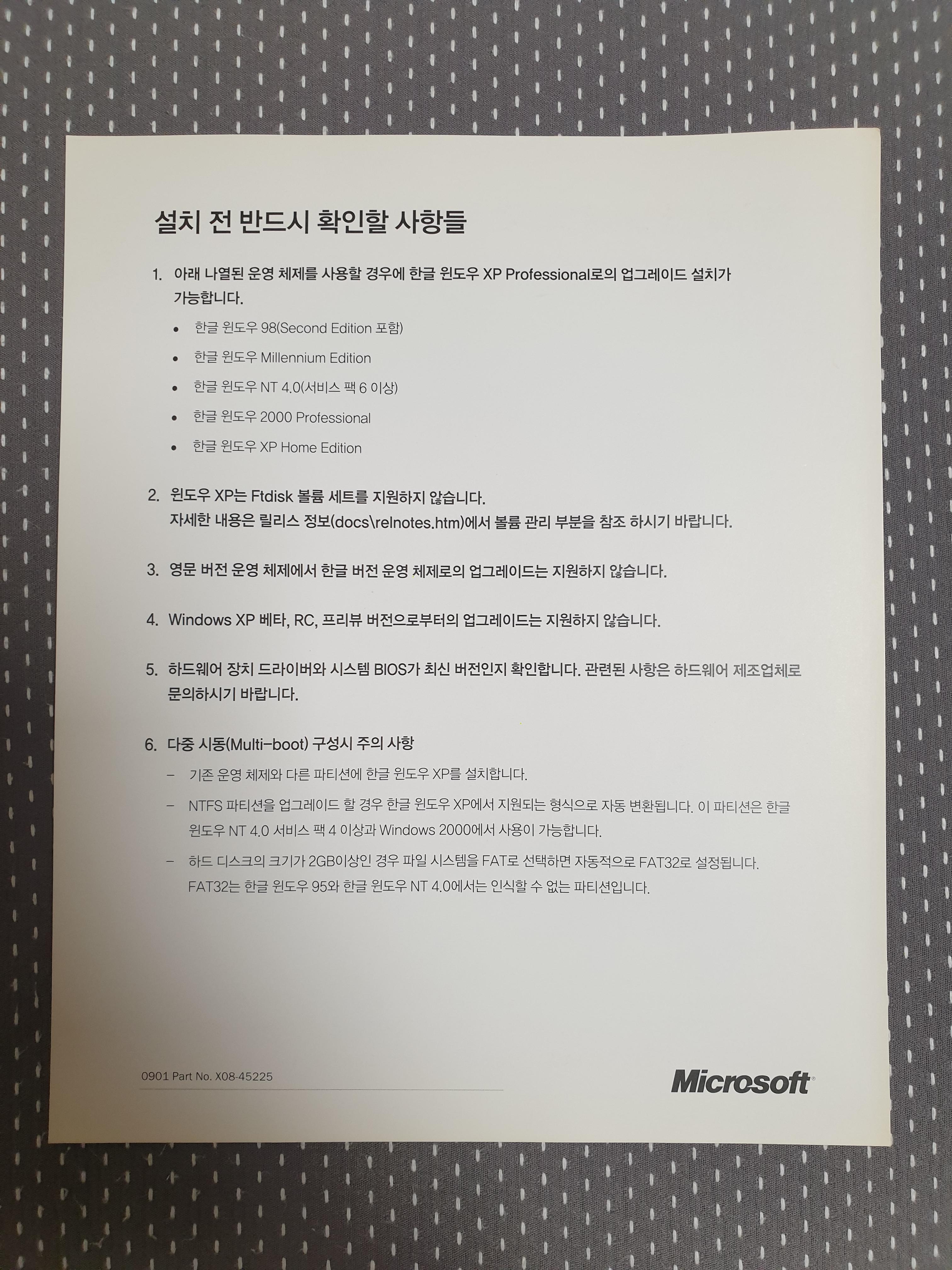 뒷면에는 설치 전 반드시 확인할 사항들이 적혀있습니다. 윈도우 98까지는 업그레이드를 지원하고 95는 지원하지 않네요 ㅠ 같은 XP인 홈 에디션에서도 프로페셔널로의 업그레이드를 지원합니다.