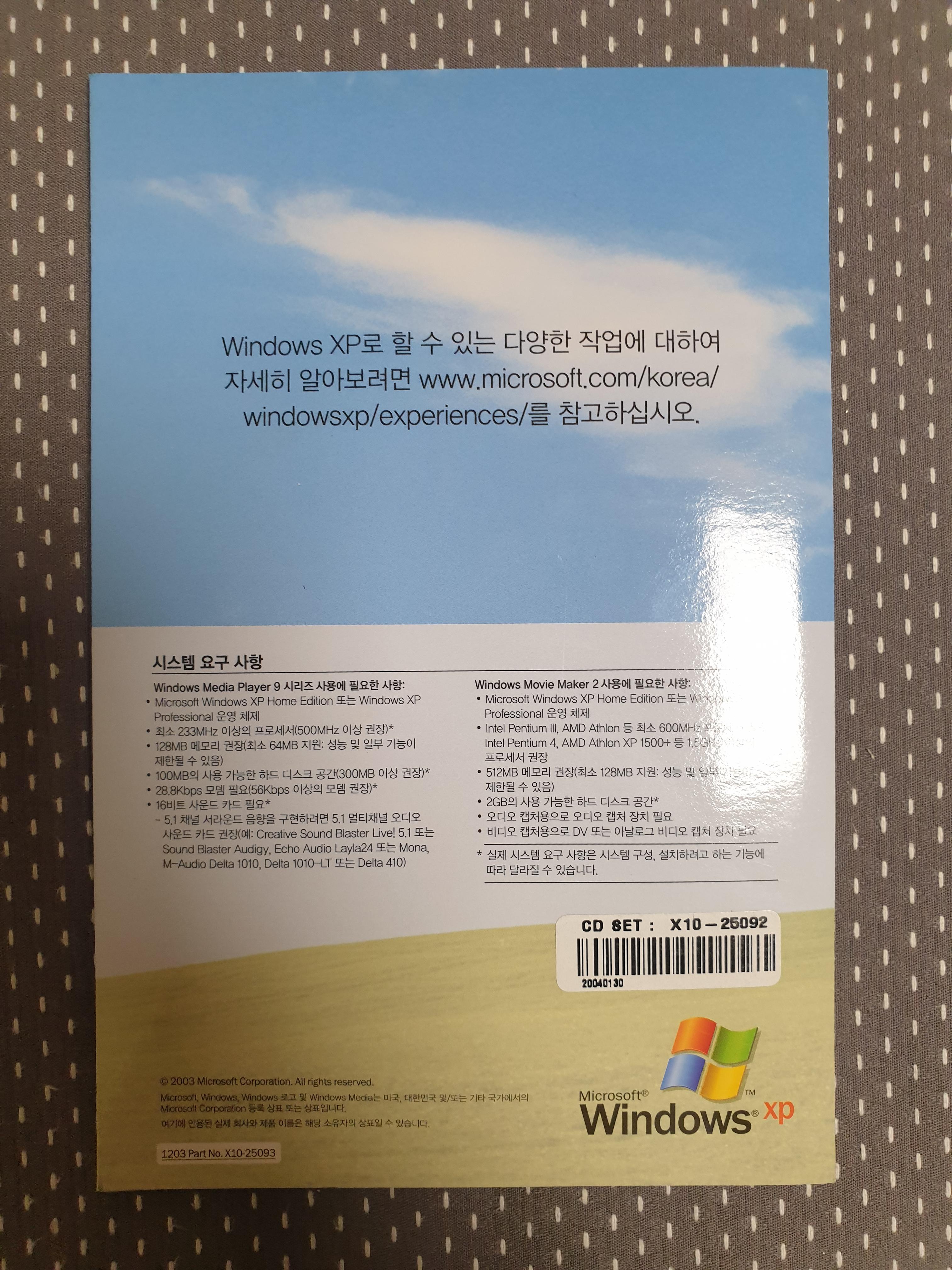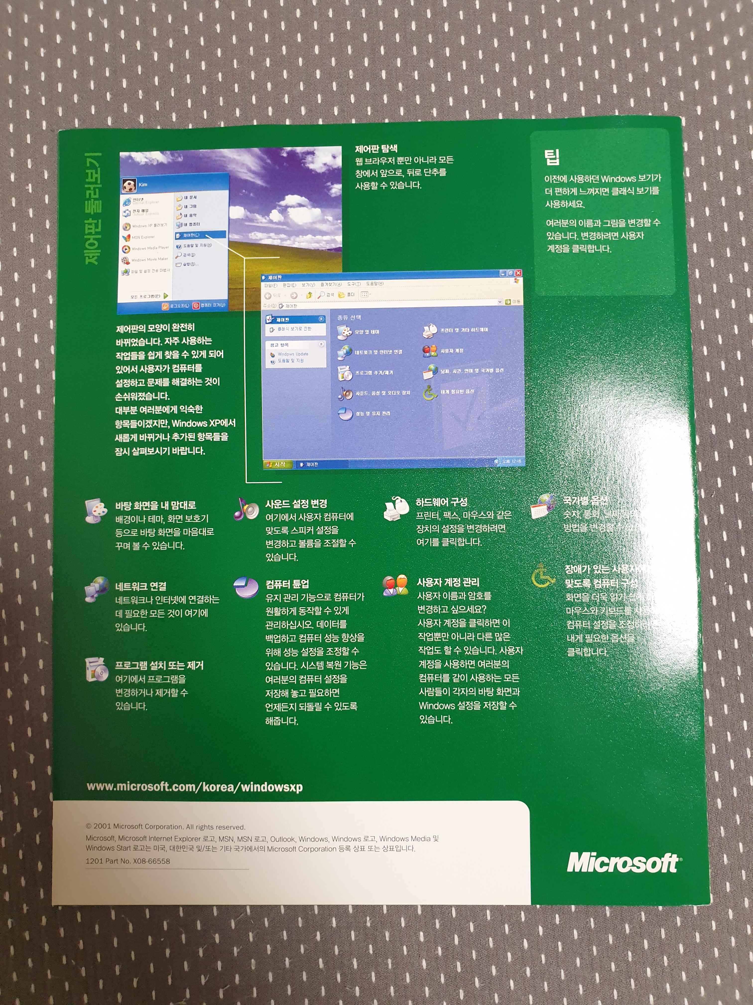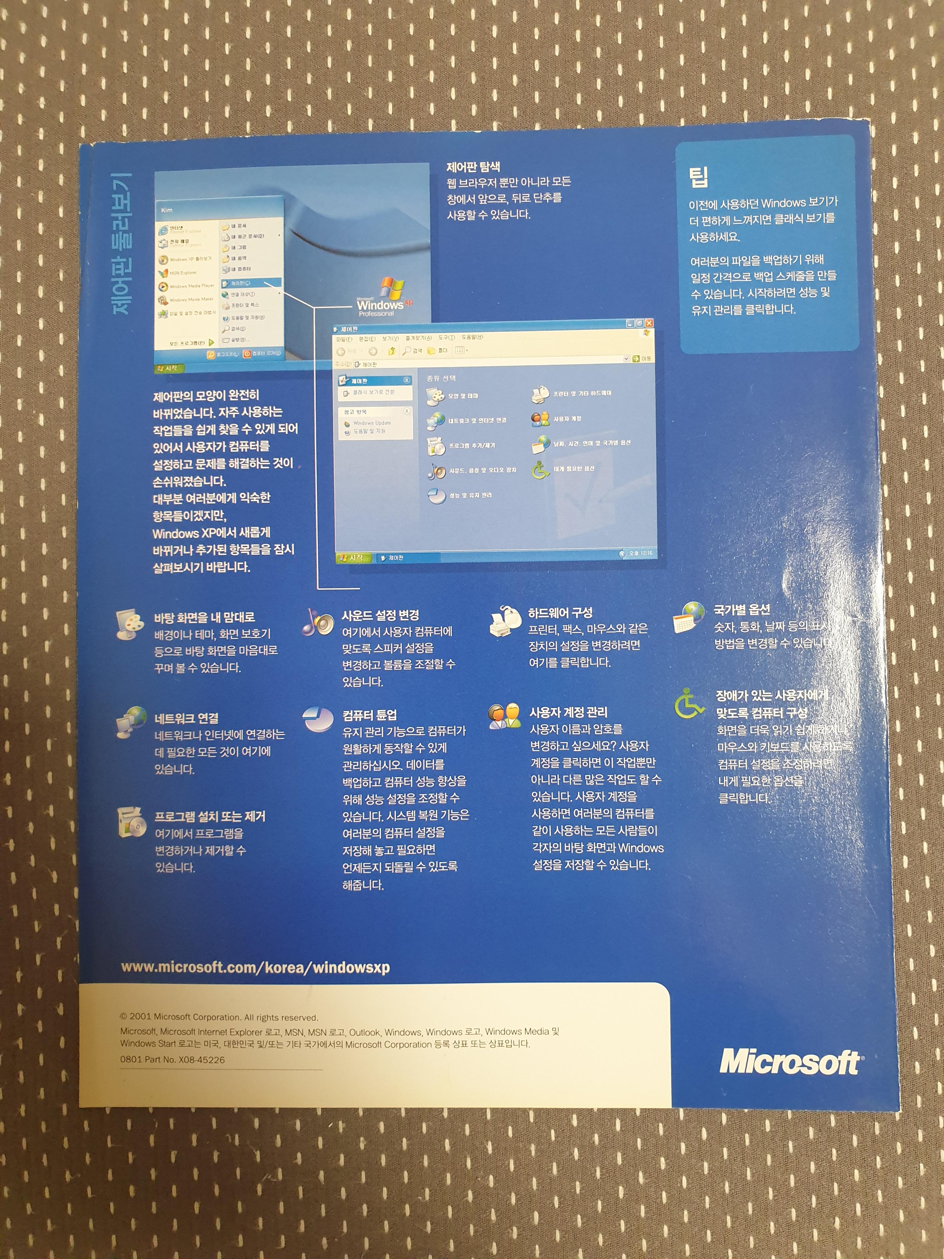 오늘 소개해드릴 소장품은 마이크로소프트 윈도우 XP 책자입니다. 사실 두 달 전 쯤에 소장 중인 윈도우 XP CD들을 소개하는 글을 소장품 게시판에 올린 적이 있습니다. 오늘 소개해드릴 것들은 그 이후에 얻은 것들인데, CD뿐만 아니라 같이 얻은 책자 안의 사용설명서를 비롯한 구성품이 다채롭더군요. 그래서 기존의 윈도우 XP CD 소개글에 이어서 적기에는 사진도 많고 해서 아예 새로 글을 쓰기로 했습니다. 이왕 이렇게 새로 쓰는 김에 CD보다는 책자 안의 구성품 위주로 다양하게 소개해보도록 하겠습니다.