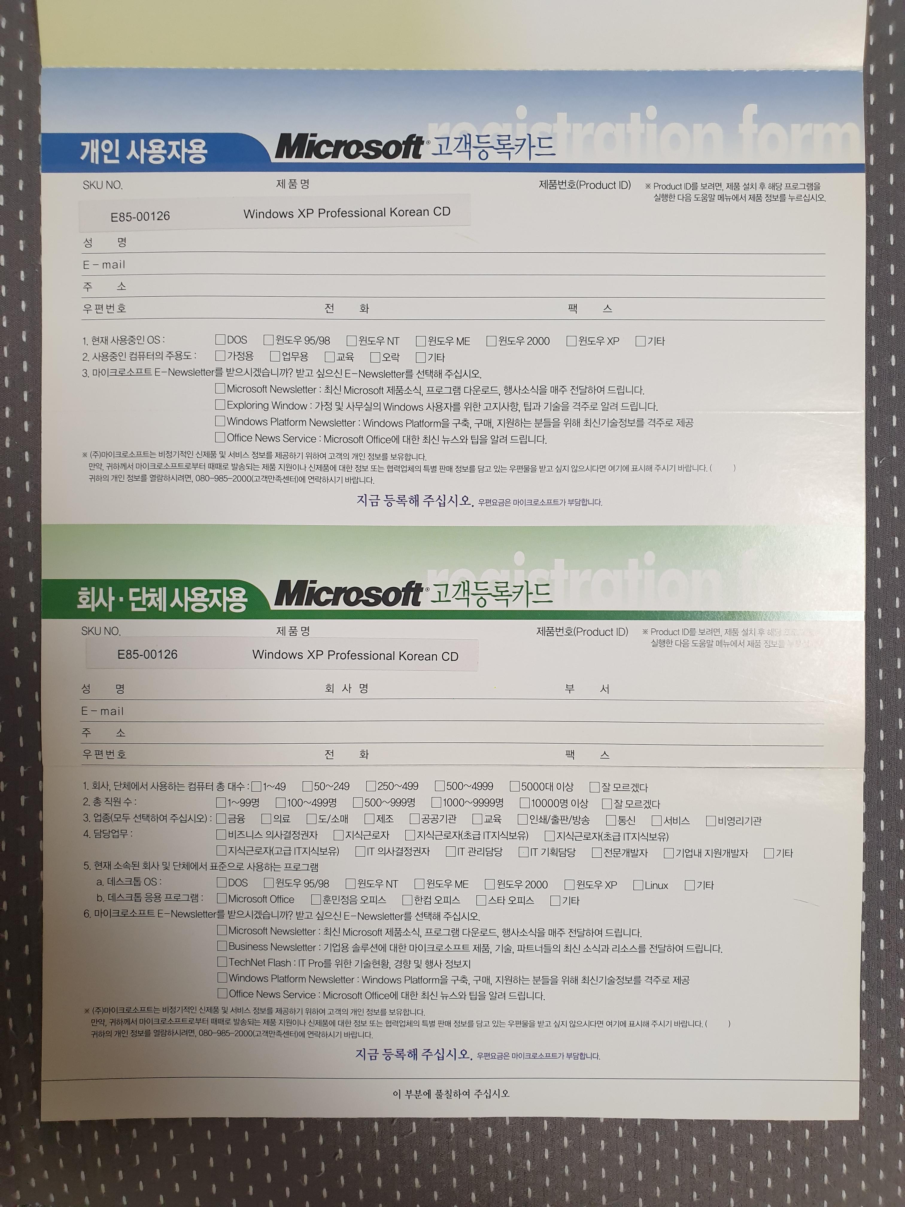 소개해드릴 제품은 윈도우 XP 프로페셔널과 윈도우 XP 홈 에디션으로 두 가지입니다. 두 제품 모두 서비스 팩이 포함되지 않은 초기 출시 제품으로, XP 출시 당시에는 이런 책자와 함께 CD를 제공했던 것으로 보입니다.