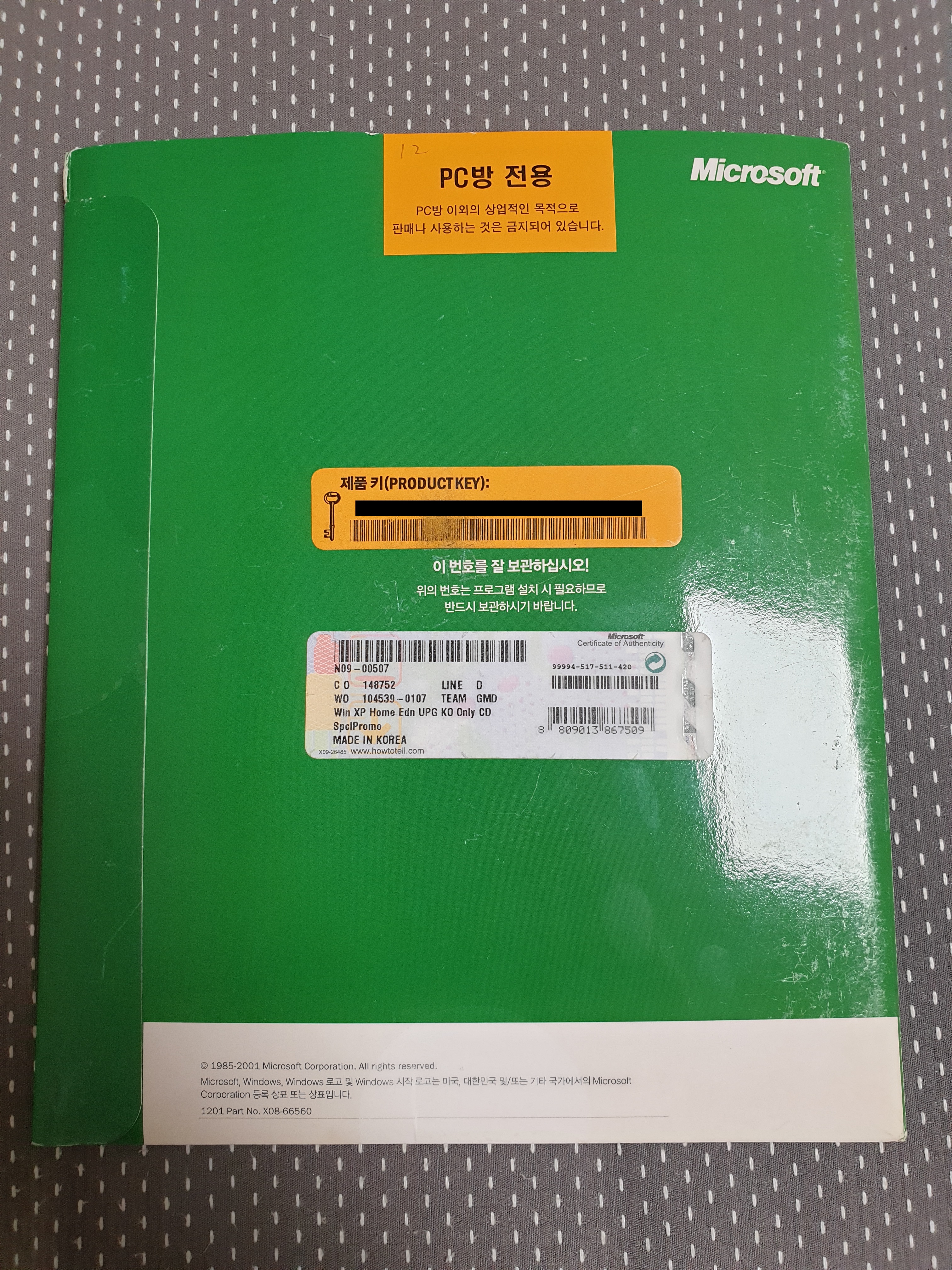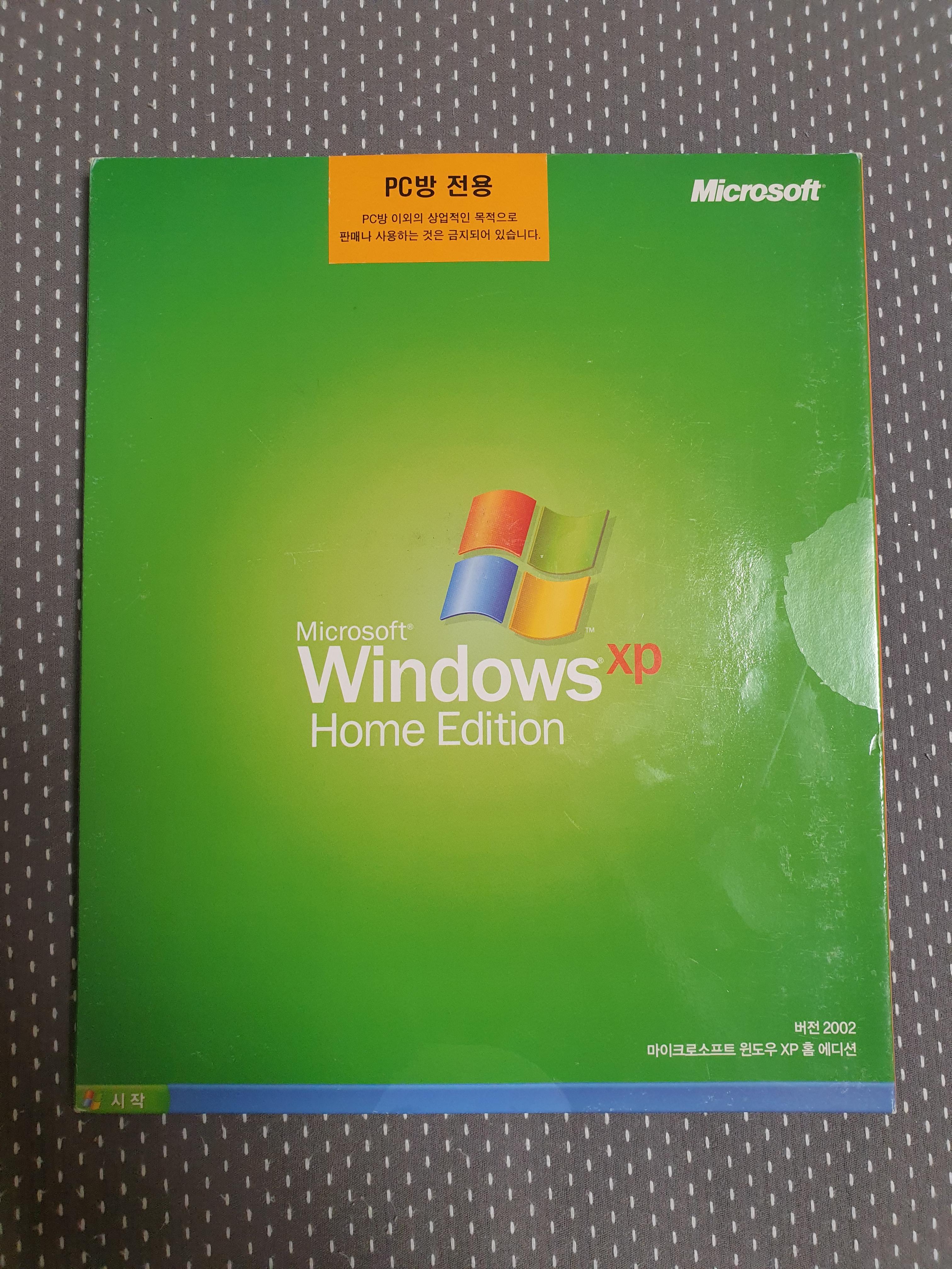 다음은 홈 에디션 버전의 책자입니다. 초록색 배경에 정중앙에 윈도우 XP 홈 에디션 로고가 있습니다. 하단에는 역시 시작 버튼과 작업 표시줄이 있구요. 우측의 문구에는 프로페셔널의 '윈도우즈'와 달리 '윈도우'라고 적혀있습니다. 상단을 보니 PC방 전용 버전인가 봅니다.