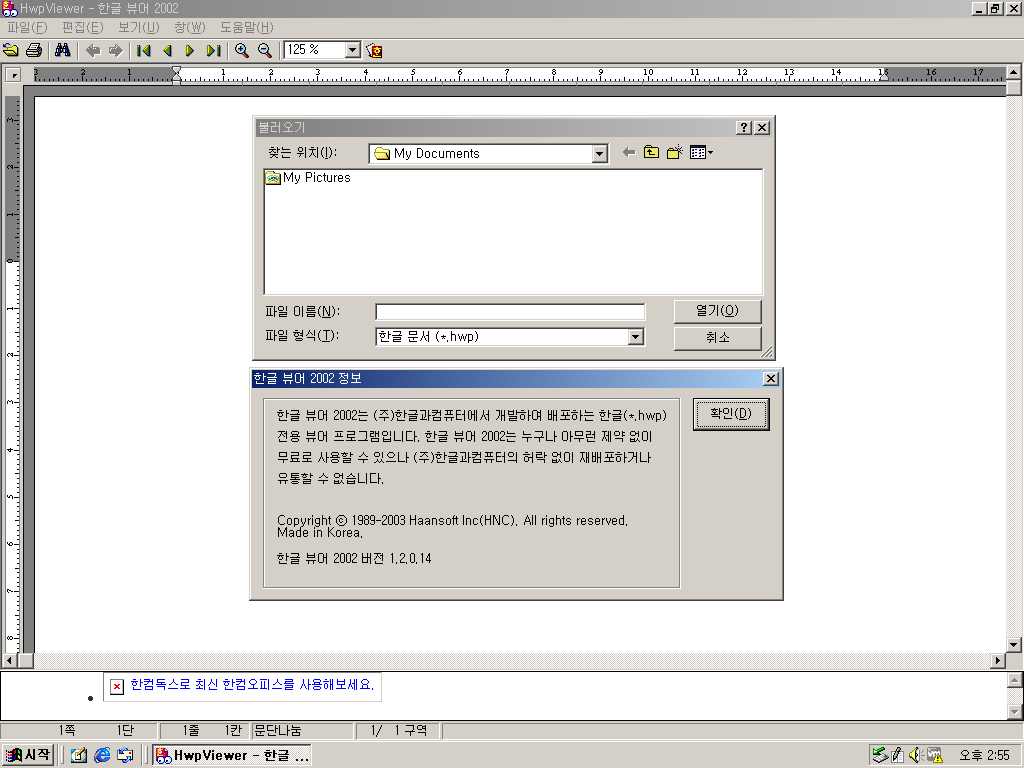 한글과컴퓨터 한글 뷰어 2002입니다. 한글 hwp 문서를 열어볼 수만 있고, 작성하는 기능은 없습니다. 보기 전용 프로그램입니다. 빌드 넘버는 1.2.0.14입니다. 2002 SE 버전인 것 같습니다. 10.98MB 설치 파일입니다.